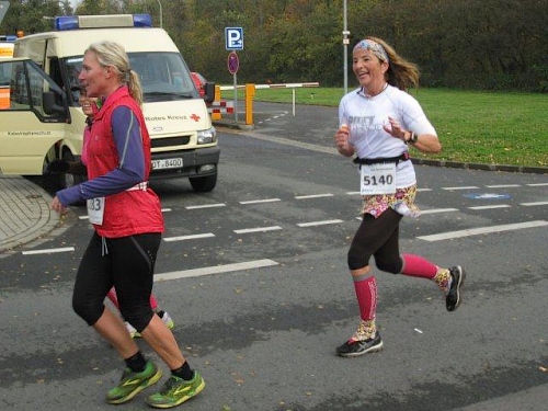 Bald kommt die letzte Verpflegungsstelle und ich nutze diese nochmals zur gründlichen Versorgung. Nachdem ich auch die Straße wieder überquert habe, sind es noch 3 Kilometer bis ins Ziel. Also nochmals den Kopf in den Nacken, denn nun könnten auch wieder Bekannte auftauchen. Die Brücke erfordert nochmals einen höheren Kraftaufwand, aber dann geht es schnurstracks ins Ziel. In der Kurve stehen schon meine Fans und jubeln mir zu. Inge hält den Zieleinlauf fest und der Sprecher begrüßt mich mit Namen und Verein. Nach 5:28:46 bin ich im Ziel und belege damit Platz 4 in meiner Altersklasse. Ich bekomme eine Medaille umgehängt, und ein Plastikcape.