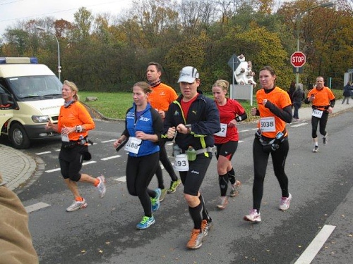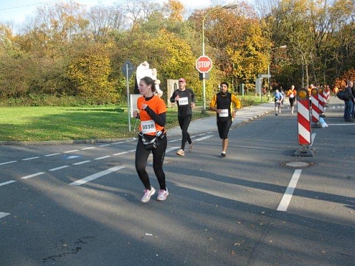 Jetzt geht es wieder zurück Richtung Postweg und nachdem wir uns nochmals verpflegen können, überqueren wir wieder den Rotbach und sehen dann bereits die Straße. Über einen Radweg gelangen wir zum Abzweig, welcher uns zum Bergwerk führt. Über eine kleine Brücke überqueren wir das Zechengelände und laufen dann zu unserem Ausgangspunkt. Seit längerem kommen uns schon die Läufer auf der zweiten Runde entgegen und ich entdecke etliche Bekannte. Immer mehr Läufer der 25 km-Runde spurten an mir vorbei ins Ziel. Ich muss aber vor dem Zieleinlauf mit einer Kehre in die zweite Runde laufen.