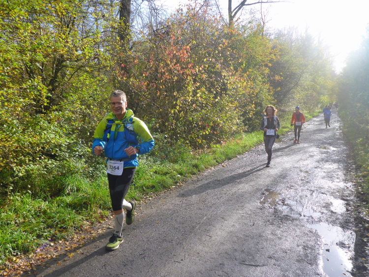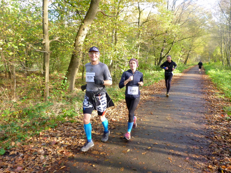 Und dann kommt plötzlich die Sonne raus und macht Hoffnung, dass es entgegen der Wettervorhersage ein schöner Herbsttag wird. Ein bisschen Abwechslung bietet die Strecke entlang des Heidhofsees, der dritte VP in der Nähe des Waldkompetenzzentrums Heidhof und später, nach VP 4, die Strecke entlang des Heidesees, wo man sich den Weg mit vielen Spaziergängern teilen darf. Schon geht es zurück, um am VP 5, welcher auch der VP 1 war, wieder auf die Zubringerstrecke Richtung Bottrop einzubiegen. Auf diesem Abschnitt ist am meisten los, auf ca. 3 km begegnen sich Ultras, die ihre Runde in Kürze beenden, mit jenen, die bereits die nächste Runde in Angriff nehmen.