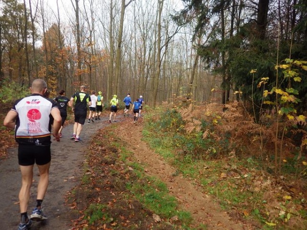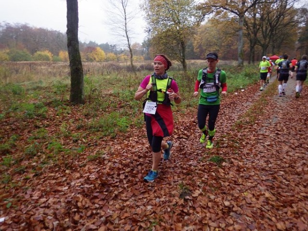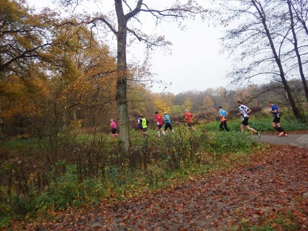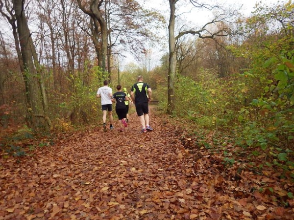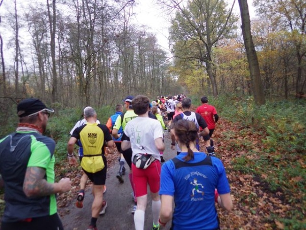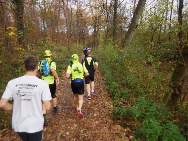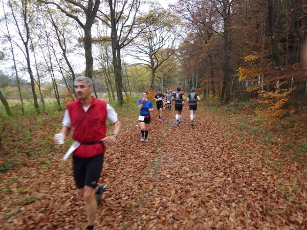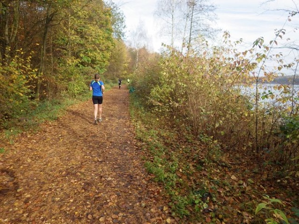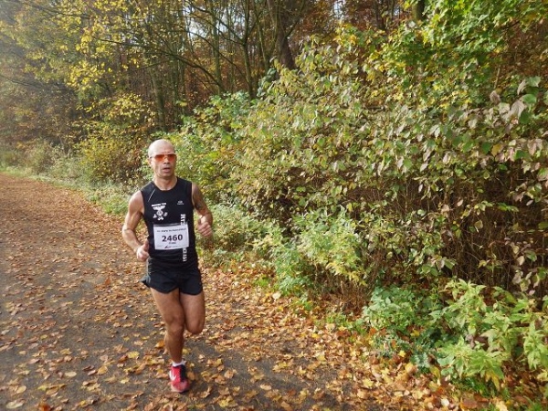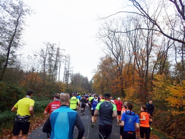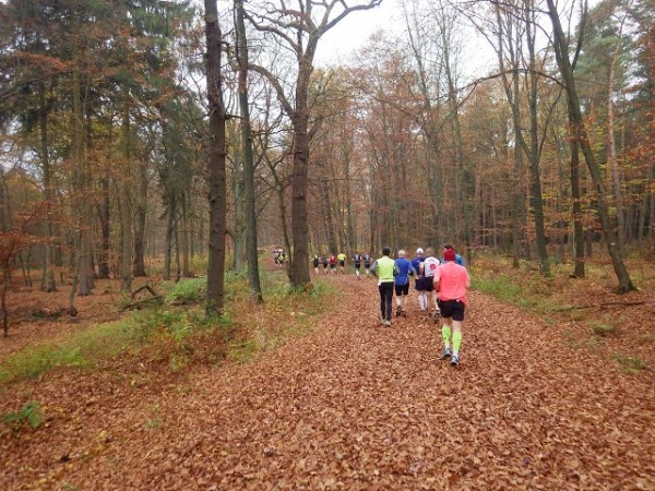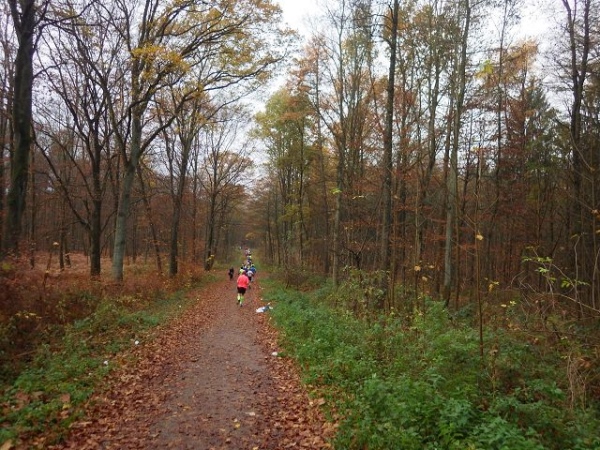 Ab hier geht es leicht abwärts, bis wir nach 2 km rechts abbiegen. Die Strecke ist im insgesamt etwas wellig, aber keinesfalls als hügelig zu bezeichnen. Der Untergrund ist fest und gut zu laufen. Das war in anderen Jahren witterungsbedingt schon deutlich anders. Es ist halt Herbst. Heute rascheln die bunten Blätter unter unseren Füßen. Landschaftlich überaus reizvoll ist unsere Strecke durch den für NRW typischen Mischwald.