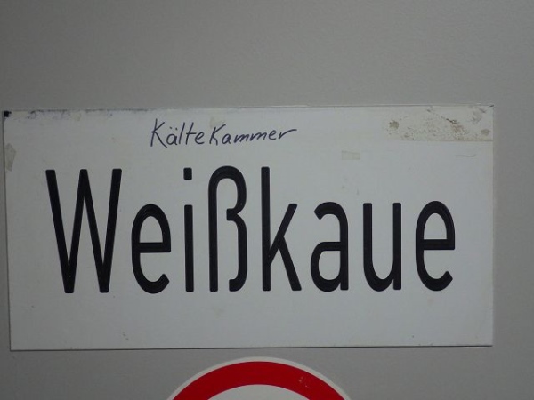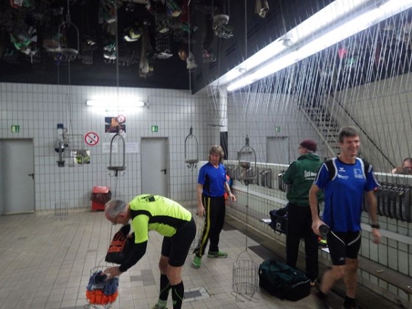 Dann geht er Bergmann nackig zur Schwarzkaue, in der seine Arbeitskleidung nach dem gleichen Prinzip verwahrt ist. Nach der Schicht wiederholt sich das Prozedere, nur eben umgekehrt. In den Duschräumen wäscht und „buckelt“ sich der Kumpel. Buckeln deshalb, weil man sich gegenseitig den Dreck vom Rücken wäscht. Nach dem Duschen geht es zurück in die Weißkaue und man zieht sich dort seine private Kleidung wieder an. Genauso läuft es für die Läufer ab. „Buckeln“ müssen wir uns aber nicht, da wir ja nur verschwitzt sind.