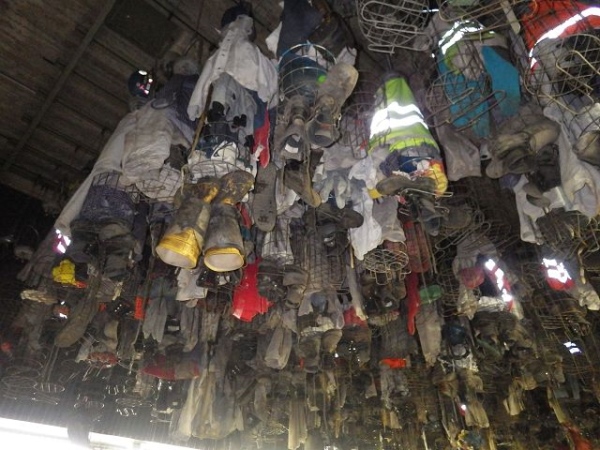 Die private Kleidung wird in der Weißkaue ausgezogen, an den sogenannten Püngelhaken, oder, wie hier auf Prosper Haniel, in einen Korb gegeben und an einer Kette mehrere Meter bis unter die Decke gezogen. Die Kette wird mit einem Schloss gesichert.