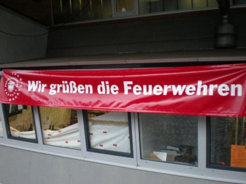 Am hintersten Tisch bleibe ich deshalb hängen, weil der Anton schon dort sitzt und sich mit Kaffee aufputscht. Er ist heute nicht für die m4y-Fraktion in Orange unterwegs, sondern für die Roten. Er der auch sonst immer schnell unterwegs ist, will heute noch einen Zacken zulegen und sich als Mitglied der freiwilligen Feuerwehr eine gute Rangierung bei den Deutschen Feuerwehrmeisterschaften erkämpfen. Ja, das gibt es, Feuerwehrleute, die nicht wie ein bulliger Tanklöschwagen aussehen, sondern wie ein Schlauchturm und deshalb schnell sind - wie das von der Feuerwehr erwartet wird.