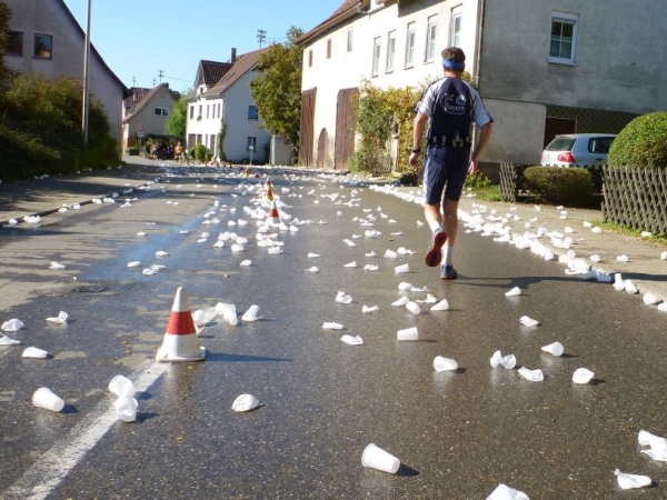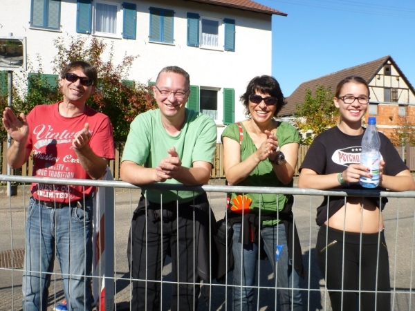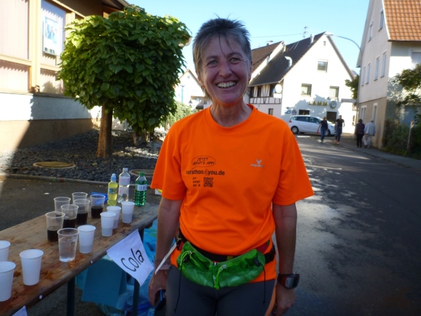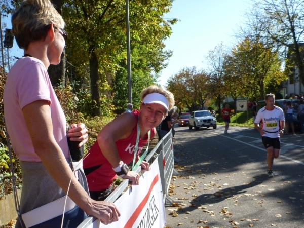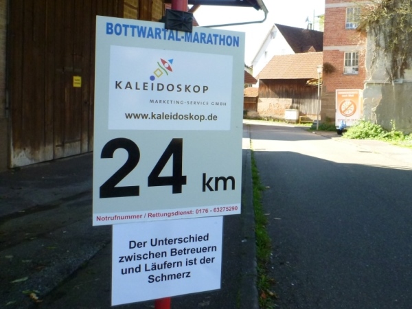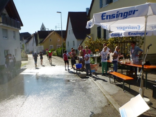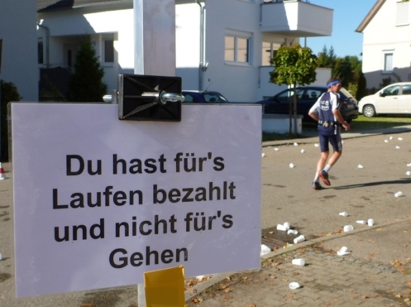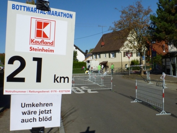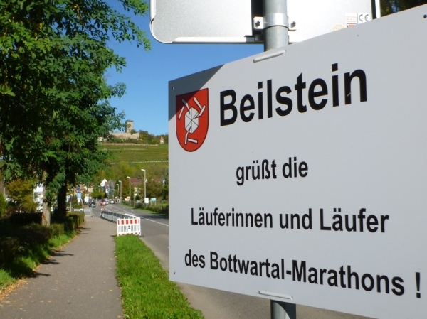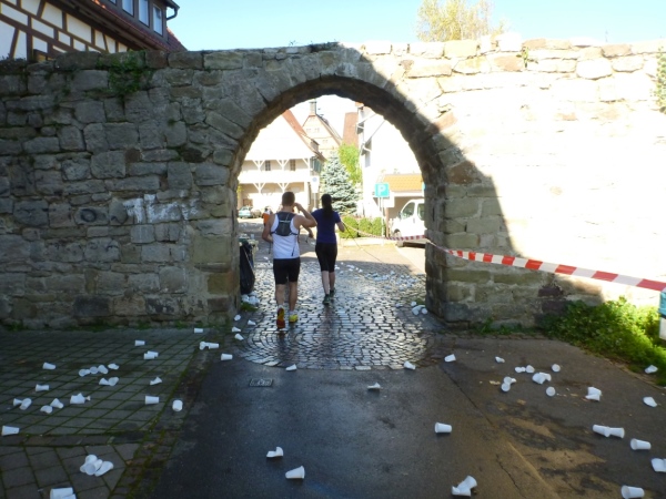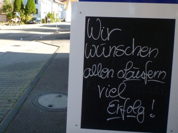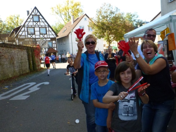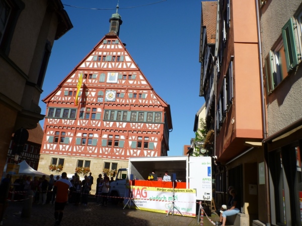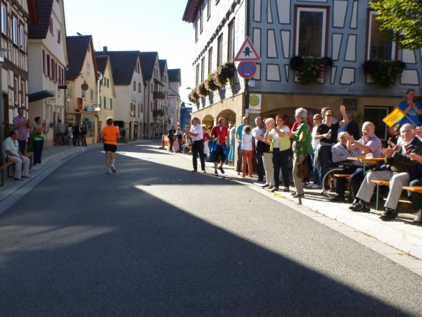 Wenn man die Schilder liest, dann könnte man englischsprechende Fans an der Strecke wähnen. Es heißt denn „Run like you have ants in the pants“ und „Run like you stole something“. Das brauche ich nicht zu übersetzen, oder? Vor dem Rathaus von Großbottwar sind die Bierbänke voll belegt, auch hier Stimmung und Moderation, jeder wird begrüßt.
