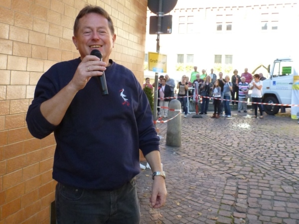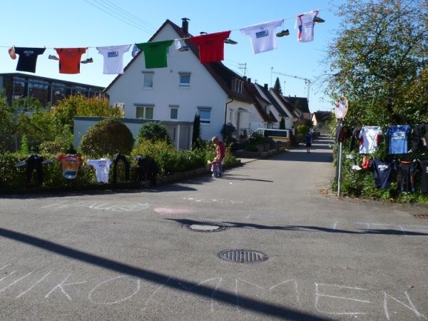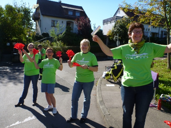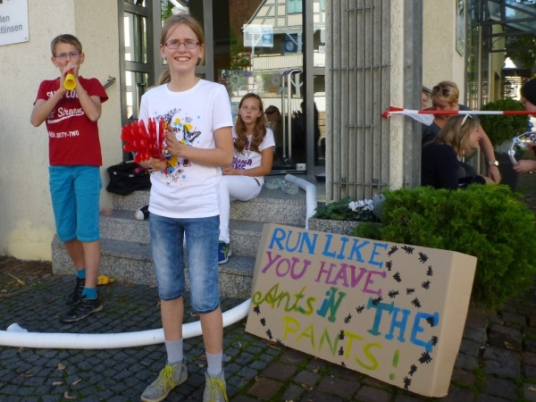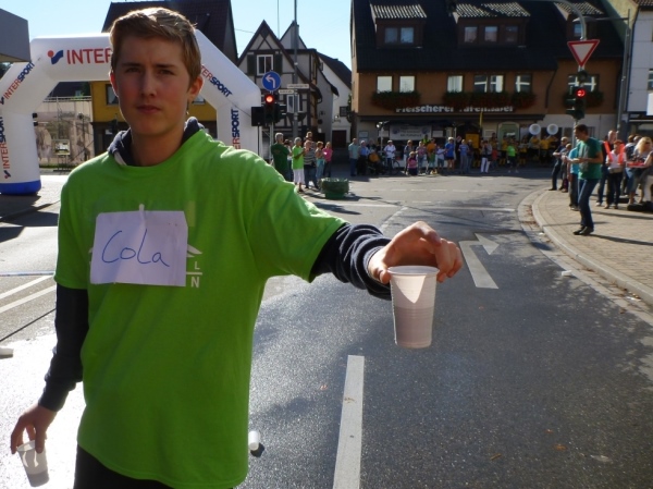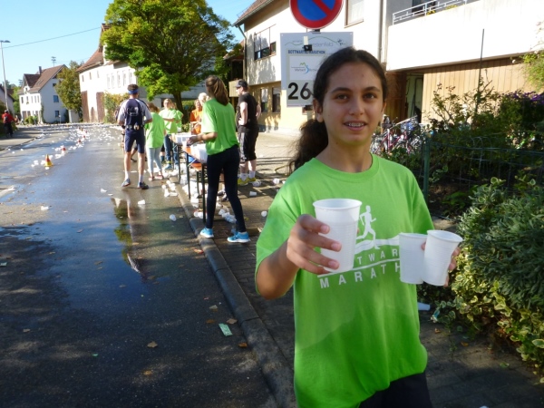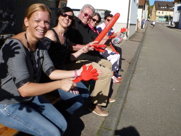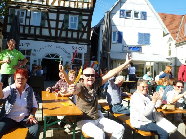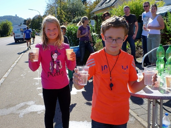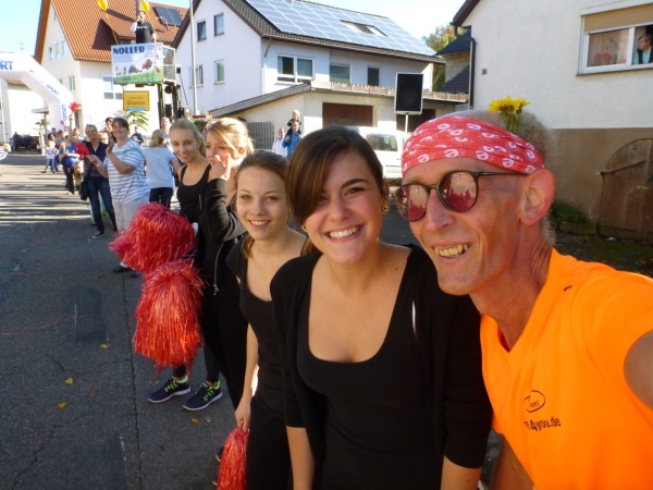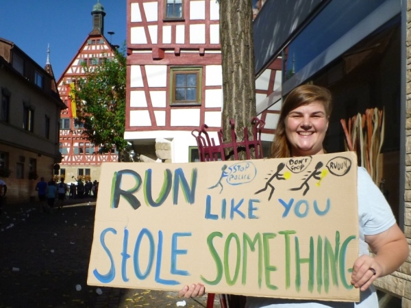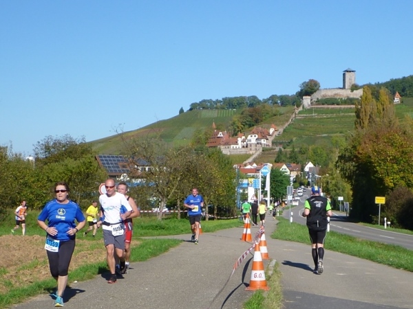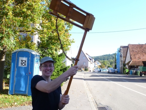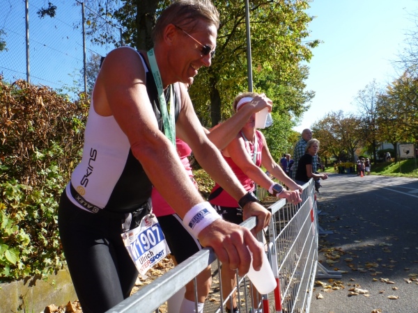 Wenn man die Schilder liest, dann könnte man englischsprechende Fans an der Strecke wähnen. Es heißt denn „Run like you have ants in the pants“ und „Run like you stole something“. Das brauche ich nicht zu übersetzen, oder? Vor dem Rathaus von Großbottwar sind die Bierbänke voll belegt, auch hier Stimmung und Moderation, jeder wird begrüßt.