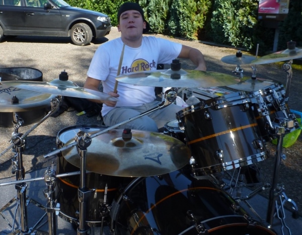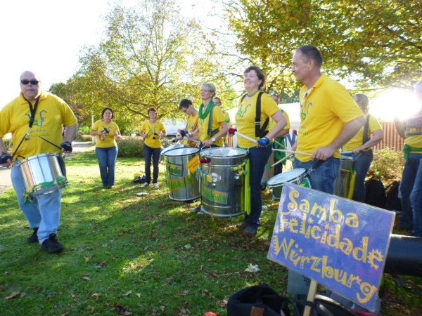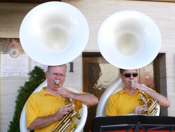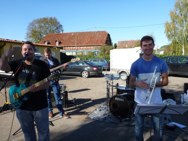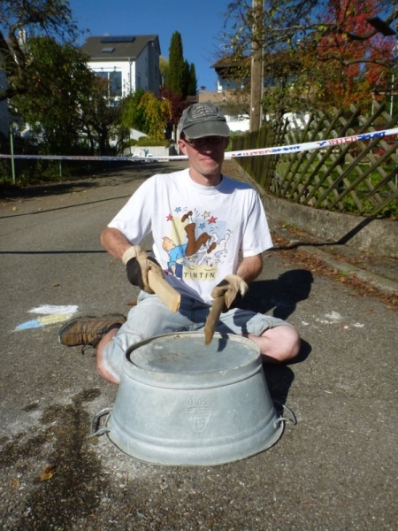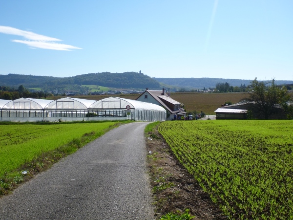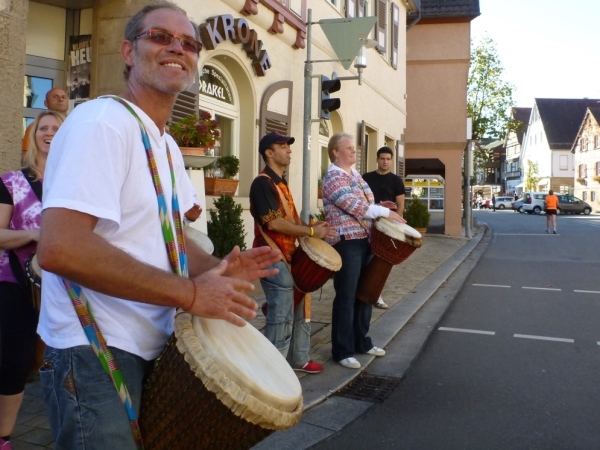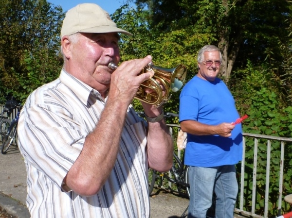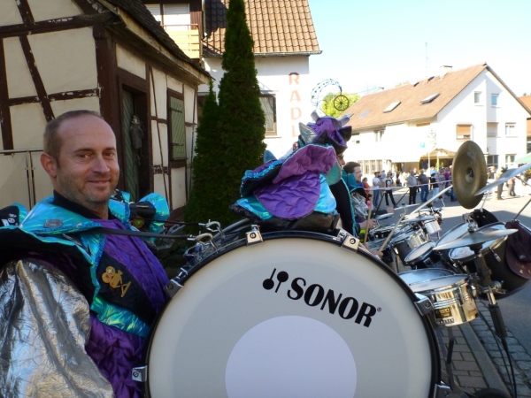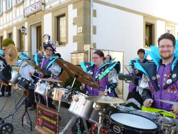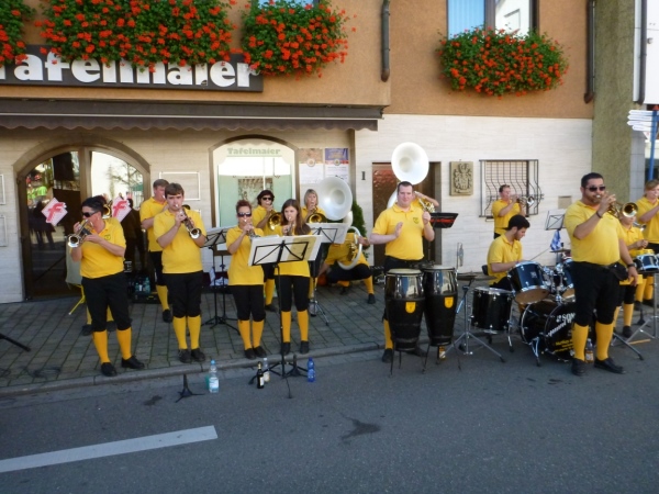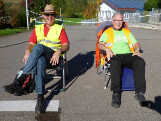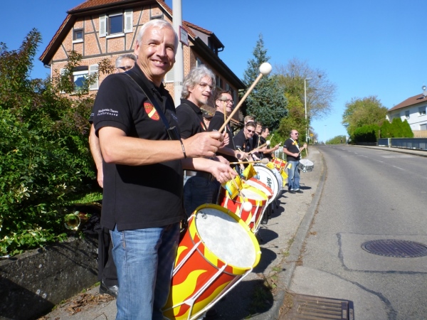Beim „Hirschen“, so der Name der Wirtschaft in Kleinbottwar, macht das Kuhberg-Echo aus Gundelsheim uns mit eine rhythmischen Guggemusik Beine. Es läuft sich wieder rund, solange wir die Musik hören. Weiter nicht. Einen guten Kilometer führt dann die Straße durch einen Wald mit etwas Schatten, der mir nun gut tut. Noch einen guten Kilometer, dann lockt mich ein Anwohner mit einem Schluck Bier zur kurzen Rast. Der ist aber besorgt um meine Muskeln. „Macht dir das nichts aus?“ so seine Frage. Ich bin ja Bayer und Bier ist bei uns ein Grundnahrungsmittel.