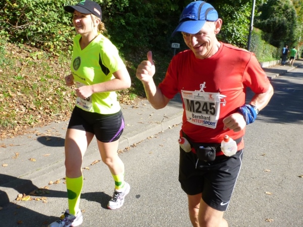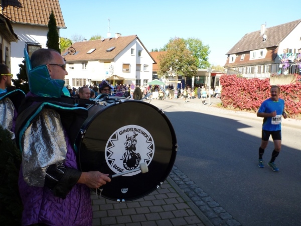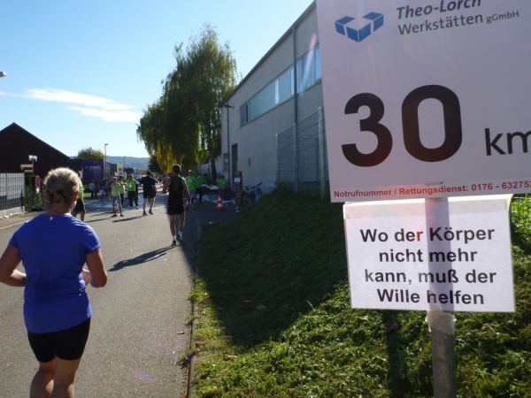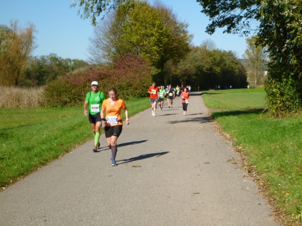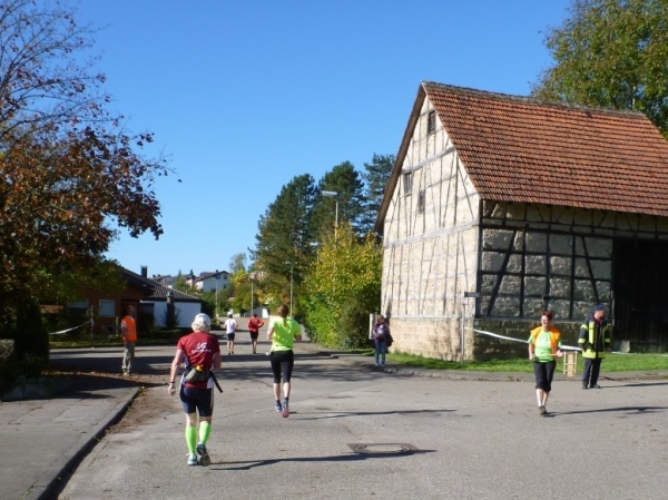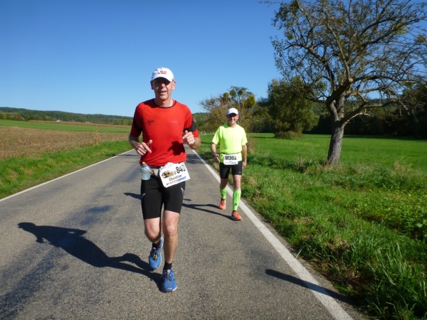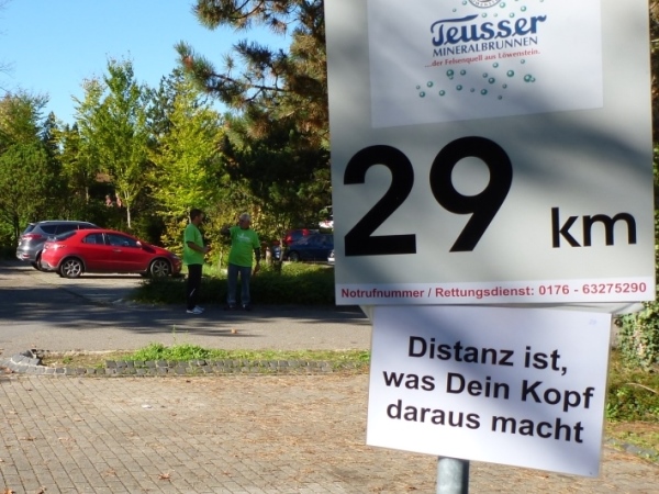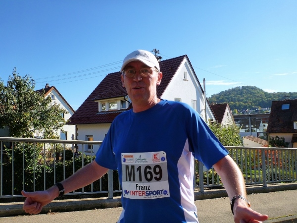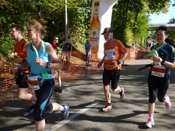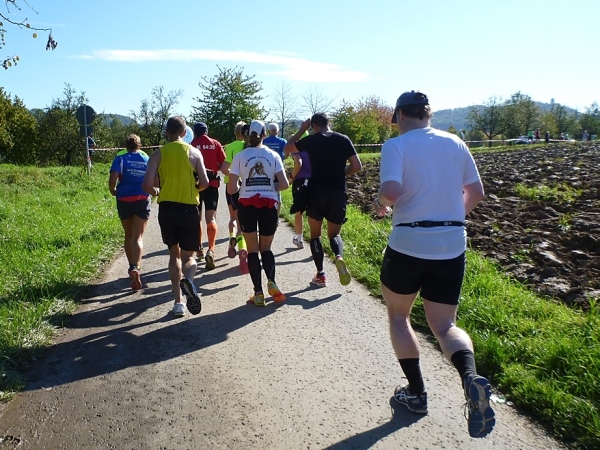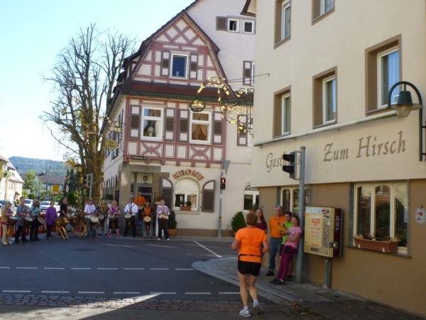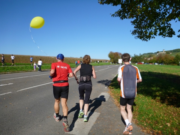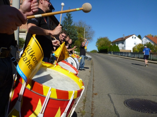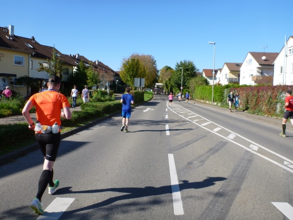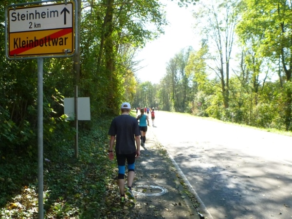 Fast einen Drehwurm bekommen wir, als wir die Landesstraße 1100 auf einer Brücke überqueren. Unten sehe ich Theo, der mit einem lauten Ruf auf sich aufmerksam macht. Nach ein paar Minuten Rennerei unterhält uns der Spielmannszug Ilsfeld. Ich kann mein Tempo halten und laufe immer weiter in das Feld der Marathonis und Halbmarathonis hinein. Darunter sind einige Zeitläufer. Durch unseren zeitlichen Vorsprung von 30 Minuten errechne ich, dass es wohl für eine Zeit unter fünf Stunden reichen kann.