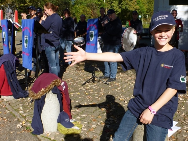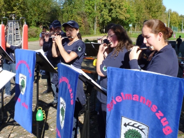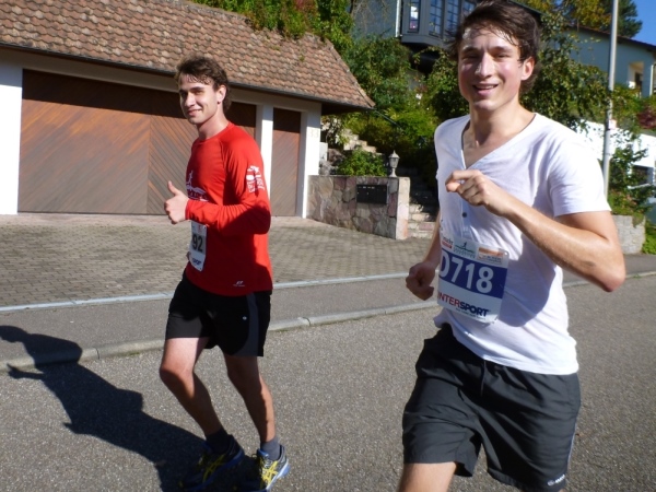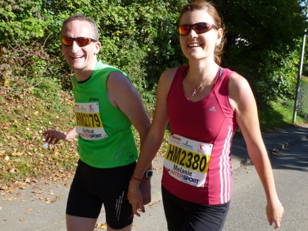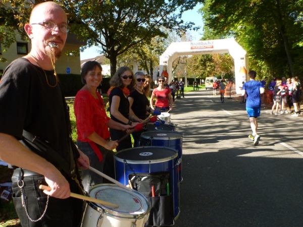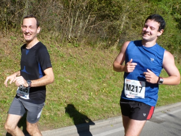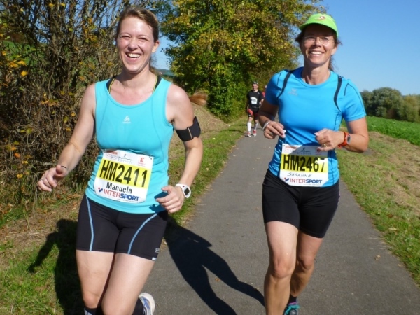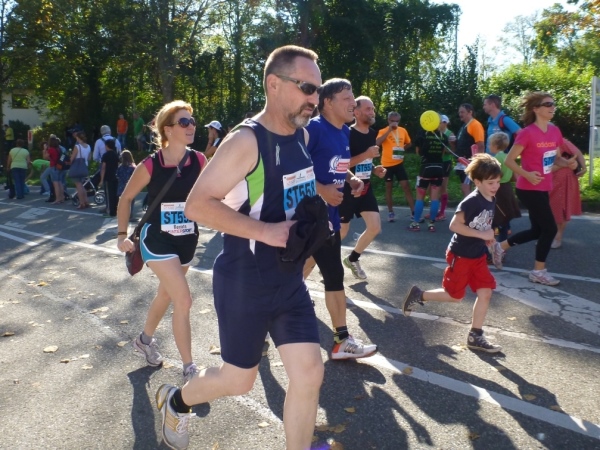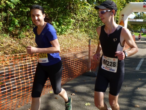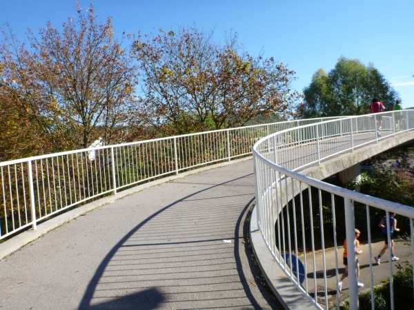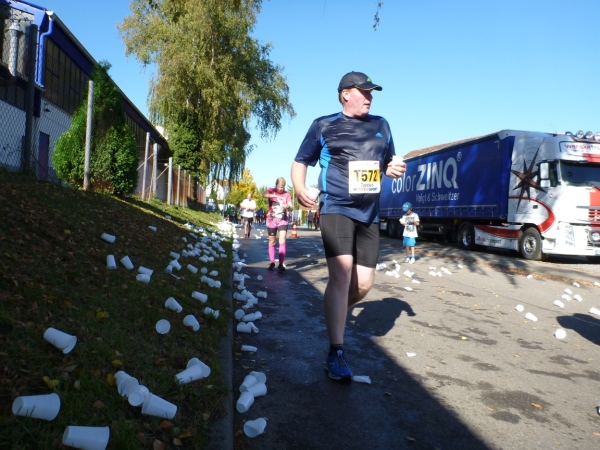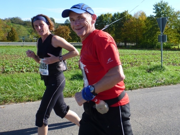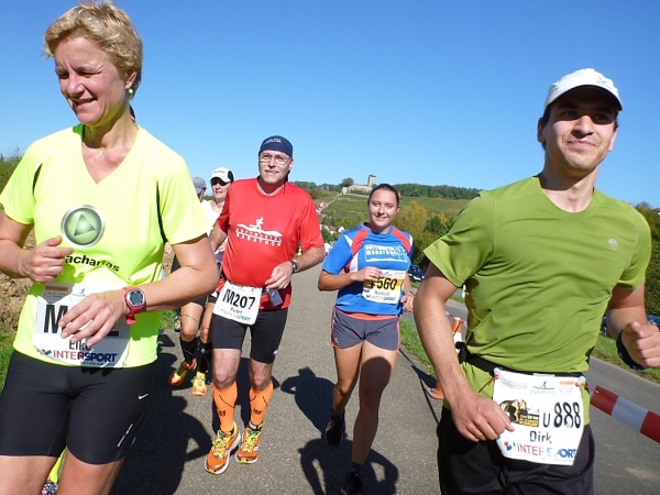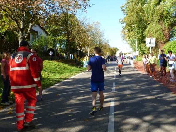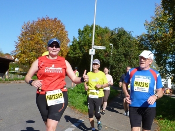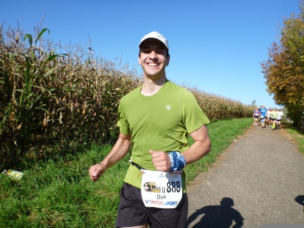Fast einen Drehwurm bekommen wir, als wir die Landesstraße 1100 auf einer Brücke überqueren. Unten sehe ich Theo, der mit einem lauten Ruf auf sich aufmerksam macht. Nach ein paar Minuten Rennerei unterhält uns der Spielmannszug Ilsfeld. Ich kann mein Tempo halten und laufe immer weiter in das Feld der Marathonis und Halbmarathonis hinein. Darunter sind einige Zeitläufer. Durch unseren zeitlichen Vorsprung von 30 Minuten errechne ich, dass es wohl für eine Zeit unter fünf Stunden reichen kann.