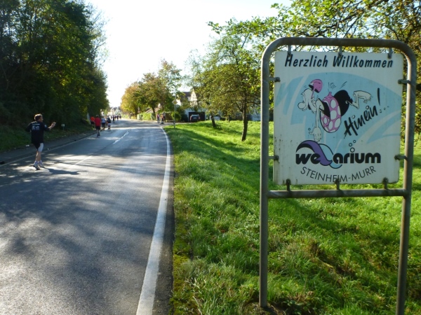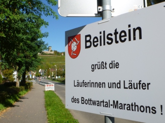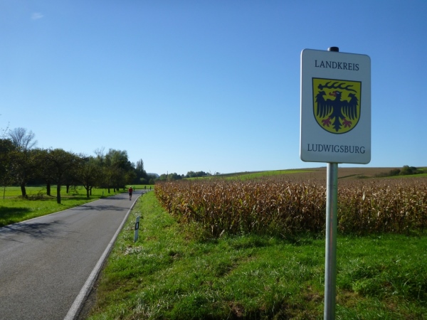 An einer kleinen Steigung laufe ich den Nürnberger Franz Schwengler auf, der eine kleine HP unter Planet-Marathon.de betreibt und der lauftechnisch viel für die fränkische Region unternimmt. Die Löwensteiner Berge umgeben den Ort mit Obstbaumwiesen, Weinbergen und Wäldern. Genau hier entspringt die Bottwar. Nach einer Schleife durch angrenzende Äcker und Wiesen tangieren wir Schmidhausen. Ein Schild weist darauf hin, dass wir den Kreis Heilbronn verlassen und den Kreis Ludwigsburg betreten haben.