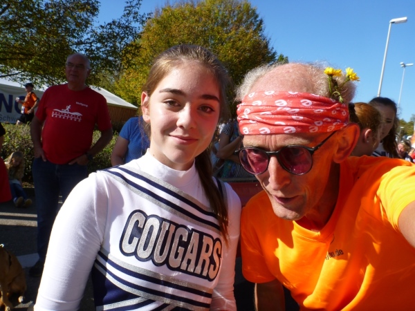 Fast schon im Talgrund sehen wir einzelne Läufer von links kommen. Das ist fast das Ende des Marathonfeldes. Und dann werde ich an der folgenden Tankstelle von einer Kollegin abgepasst. Eigentlich wollte ich mich im Rennen an Birgit Fender heranschleichen, aber nun ist sie im Vorteil. Denn der Theo Huhnholt, kurz vor mir, hat mich angekündigt. Wir wechseln kurz ein paar Worte, sie gießt sich einen Becher Wasser über die Birne und ich mache mich nach einer kurzen Schäkerei mit einem Cheerleader-Mädchen vom Acker.