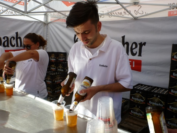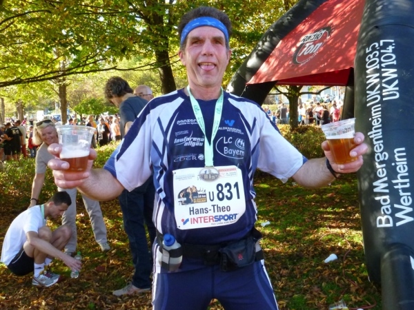 Im Ziel sehe ich dann den Theo nicht bei einer Halben, sondern der hält sich an zwei Bieren fest. Mein Versorgungsgang führt mich auf direkten Weg zum Krombacher Stand, wo wir Radler und bleifreies Weizen erhalten. Nebenan im Verpflegungszelt werden Getränke, Riegel, Obst, Hefezopf und Brezen ausgegeben.