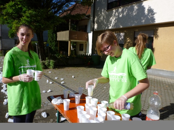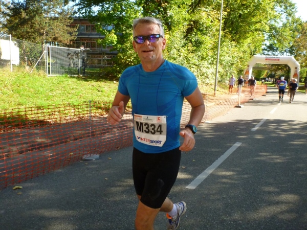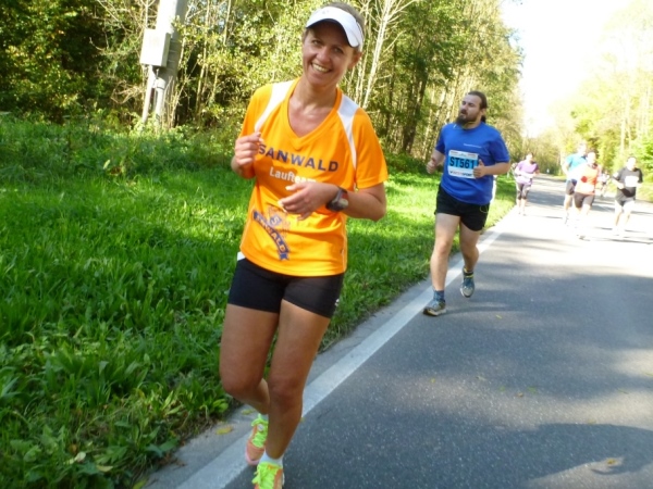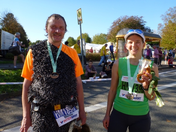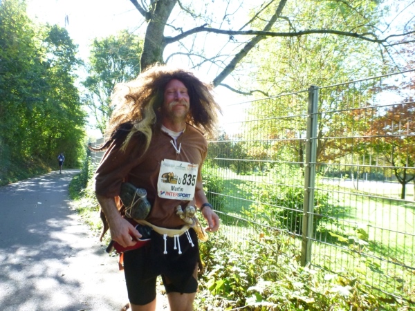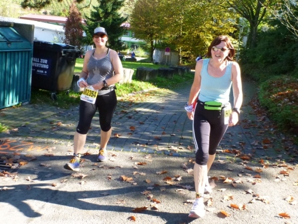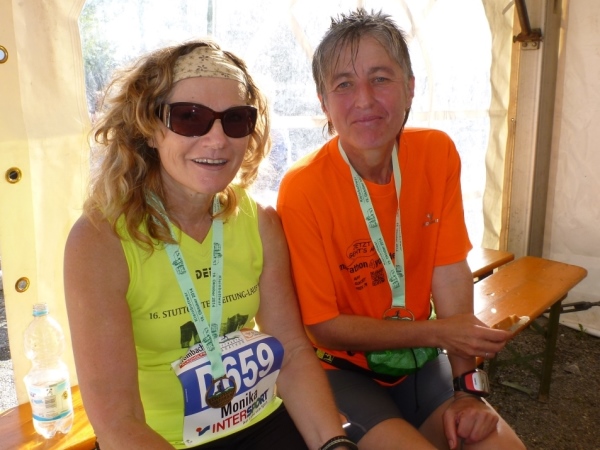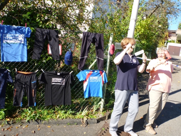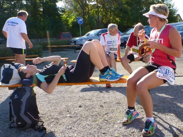 Ein wenig dauert es, dann kommt auch Laufkollegin Birgit heran gelaufen. Sie hat leider die 5 Stunden-Marke knapp gerissen, dafür aber reichlich Bilder gesammelt. Duschen kann man gleich nebenan im Bad (Frauen) oder in der Halle oder im Sportheim (Männer). Hervorragend gelöst ist die Ausschilderung. Du gehst keinen Meter zu viel zur Kleiderausgabe oder zur Riedhalle.