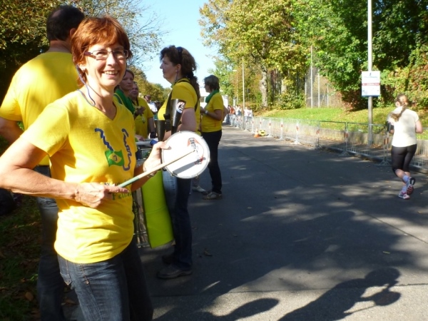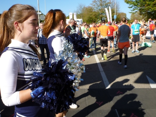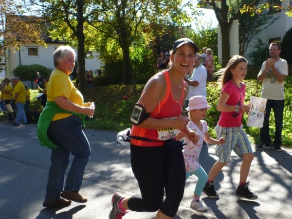 Gronau hat im letzten Jahr den Wettbewerb als Stimmungshochburg gewonnen. Es herrscht immer noch gute Stimmung, obwohl im Startbereich der Halbmarathonis schon einige Helfer mit den Abbau nicht mehr benötigter Sachen begonnen haben. Loben muss ich die Anwohner, die einen trommeln auf einer Blechwanne, die anderen halten ihre Riesenknarren in Betrieb, wieder andere feiern ihre private Party an der Straße.