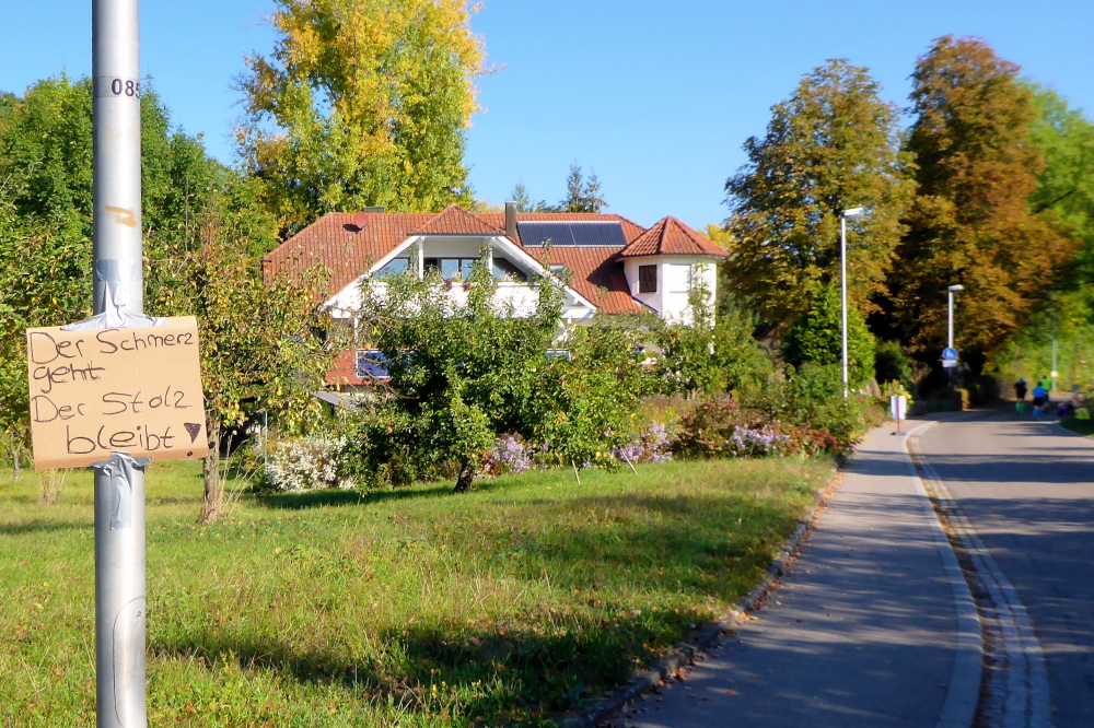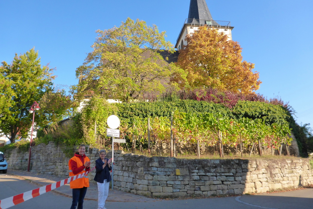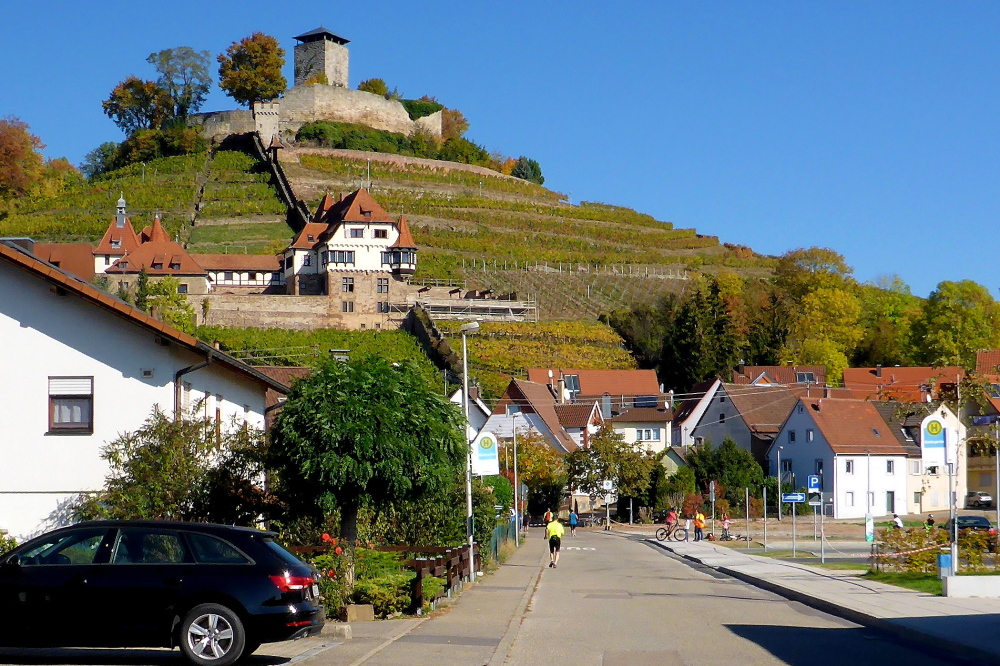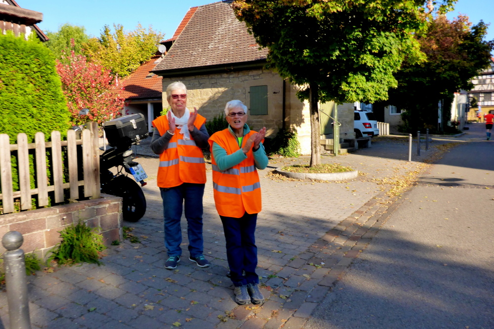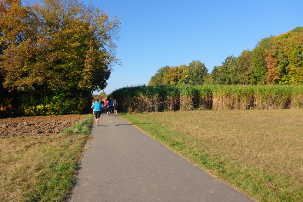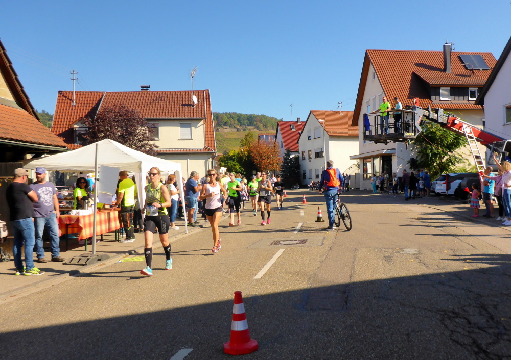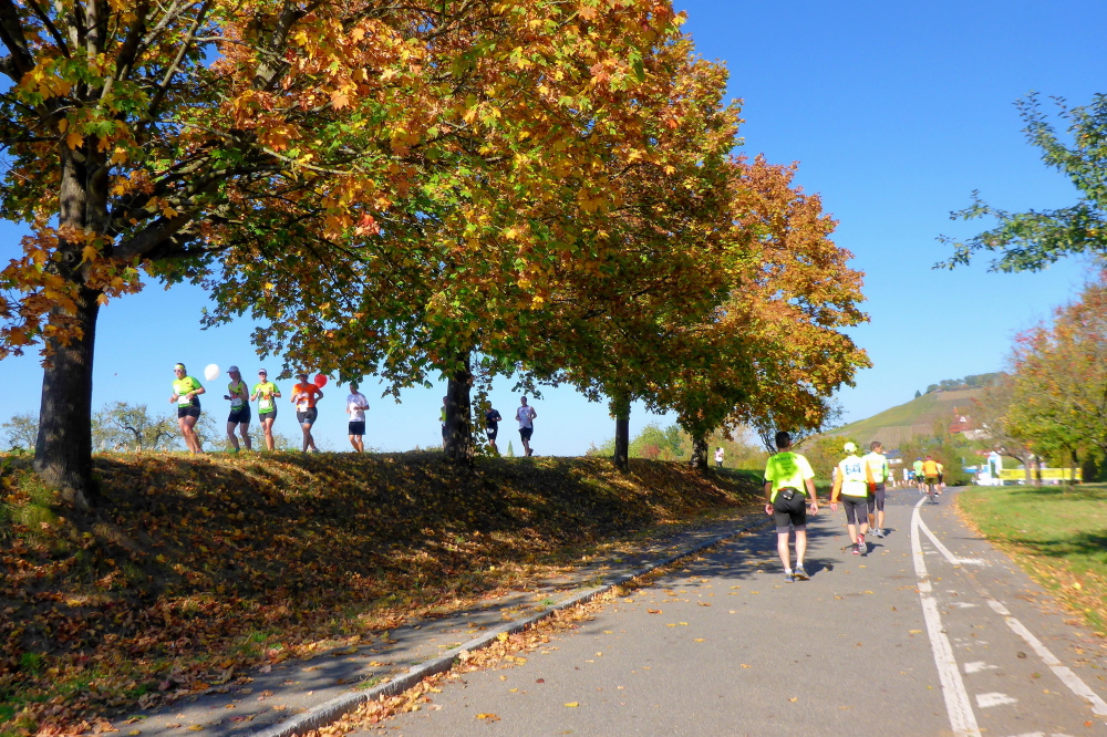 Hinter km 12 erreiche ich Kleinbottwar und werde mithilfe von gelben Pfeilen durch den Ort gelotst. Weil die Pfeile auch in die Gegenrichtung zeigen, wird es hier später wohl wieder retour gehen. Schön ist, dass viele Gruppen von Zuschauern die Läufer anfeuern. Zwischen Kleinbottwar und Großbottwar verläuft der Radweg zwischen bunten Obstbäumen und gelbgrünen Wiesen. Die Weinberge im Hintergrund sind ebenfalls schon bunt. Die Gegend hier ist einfach klasse. Hinter km 15 gibt es etwas zu trinken. Es geht nun ziemlich lange auf der Kreuzstraße geradeaus durchs Wohngebiet.