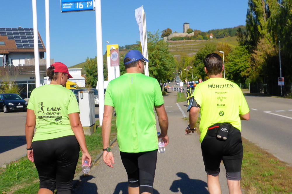 Die Jungs an der VP (km 38) bieten mir eine Dusche an. Vielen Dank, aber ich verzichte. Die zwei Kilometer bis Kleinbottwar sind noch einmal zäh und der Weg hat wenig Schatten. Immer wieder muss ich Gehpausen einlegen. In Kleinbottwar gibt es noch ein letztes Mal Wasser und aufmunternde Worte.