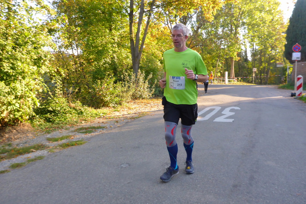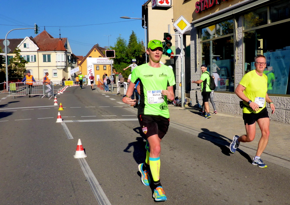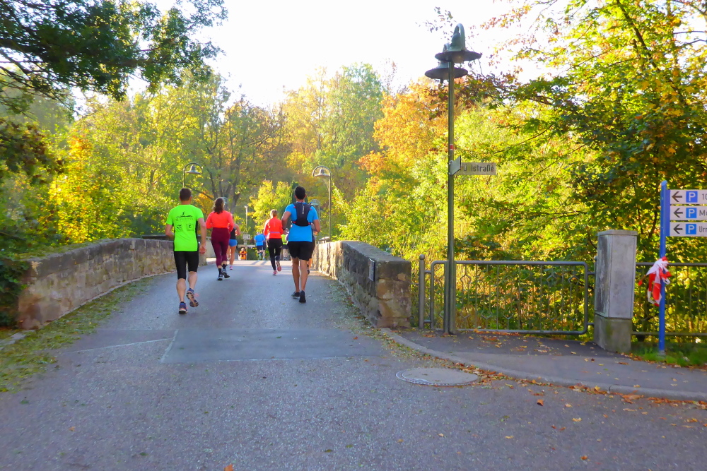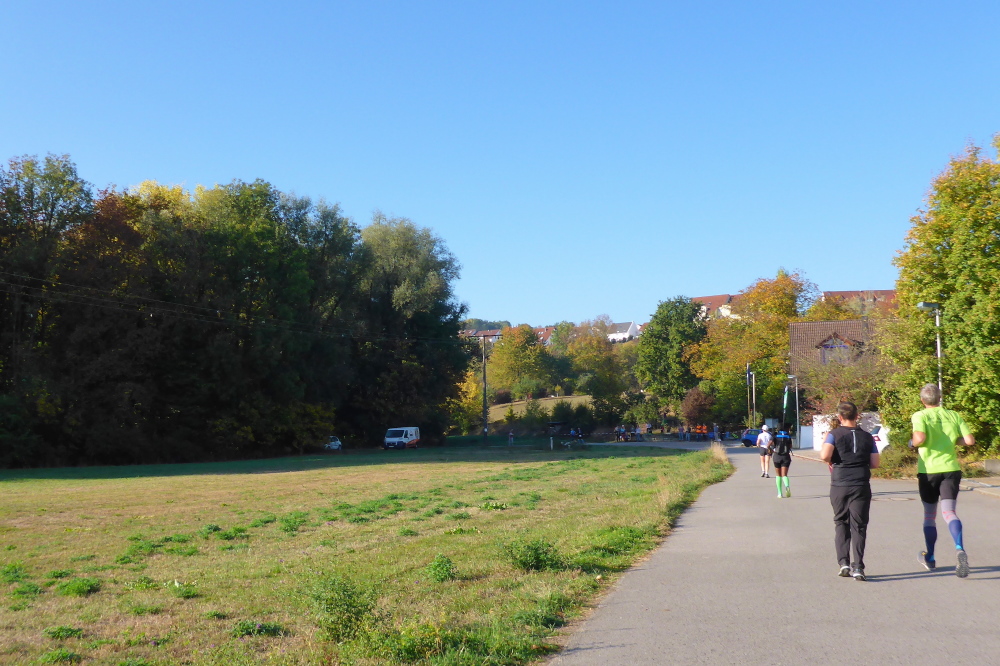 Pünktlich um 9 Uhr 30 geht es los. Wir laufen die Ludwigsburger Straße entlang. Nach ein paar hundert Metern geht es durch Wohn- und dann Industriegebiet. Hinter km 1 steht schon die erste VP. Warum so früh, wird sich später klären. Noch ein paar Schritte und wir finden uns erneut beim Steppi wieder. Die Zuschauer feuern uns frenetisch an und auch der Sprecher gibt sein Bestes. Wieder auf der Ludwigsburger Straße, laufen wir nun bis zum Kirchplatz und vor dem schön restaurierten Fachwerk-Rathaus rechts. Eine steinerne Brücke führt uns über die Murr und auf den Marbacher Weg. Hinter km 2 liegt plötzlich das freie Feld vor uns. Die bunten Shirts der Läuferschlange harmonieren vortrefflich mit den herbstlichen Farben der Natur. Irgendwo hier hinter Bäumen fliest die Bottwar in die Murr.