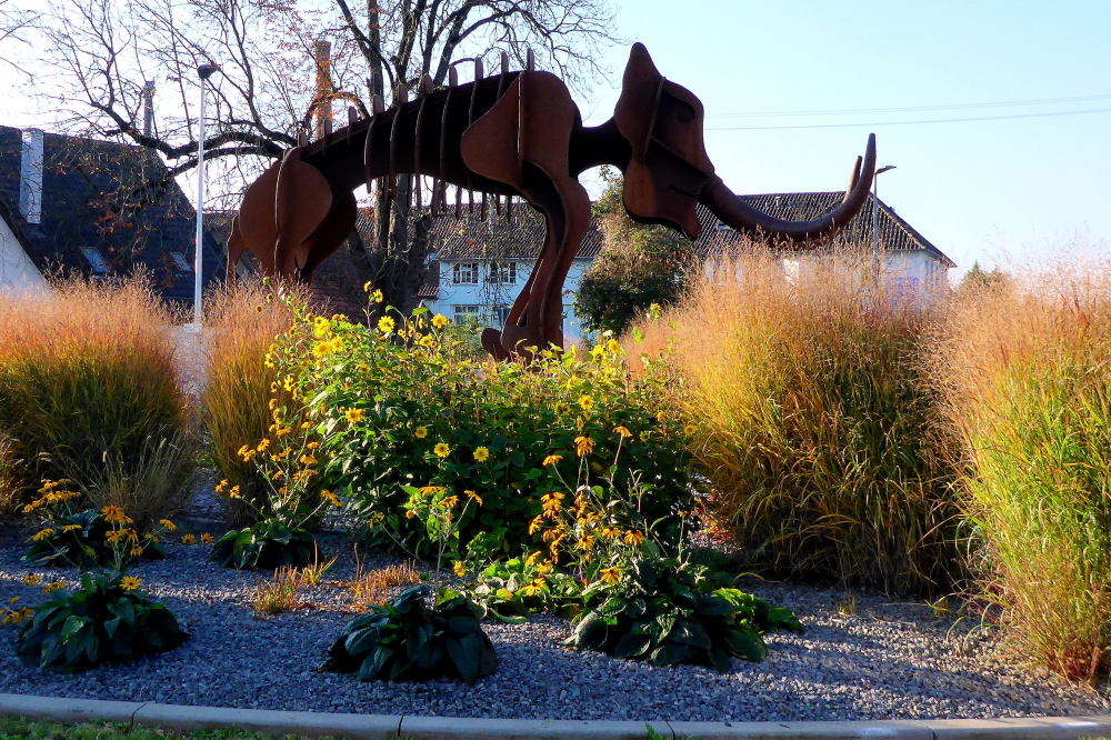 2014 hat auch das Wetter gepasst und Norbert und ich konnten den schönen Lauf genießen. 2015 nahm ich endlich den Urmensch-Ultra unter die Füße - 52 für mich unvergessliche Kilometer abseits des Marathontrubels. Weil die Riedhalle seinerzeit umgebaut wurde, war der Start und das Ziel für die Läufe in den Ortskern um den Kreisverkehr mit dem Steppi, einer metallenen Nachbildung eines urzeitlichen Steppenelefanten, verlegt. Für mich ein stilechtes Vergnügen mit dem Vorteil, dass die letzte Steigung wegfiel.