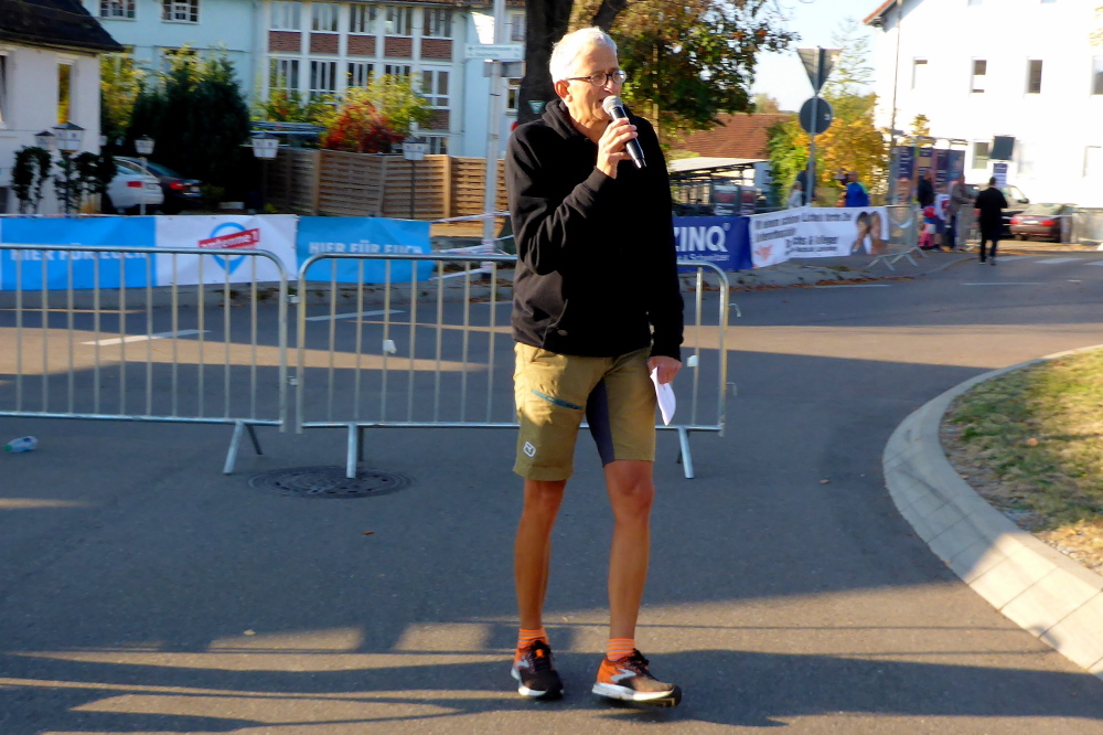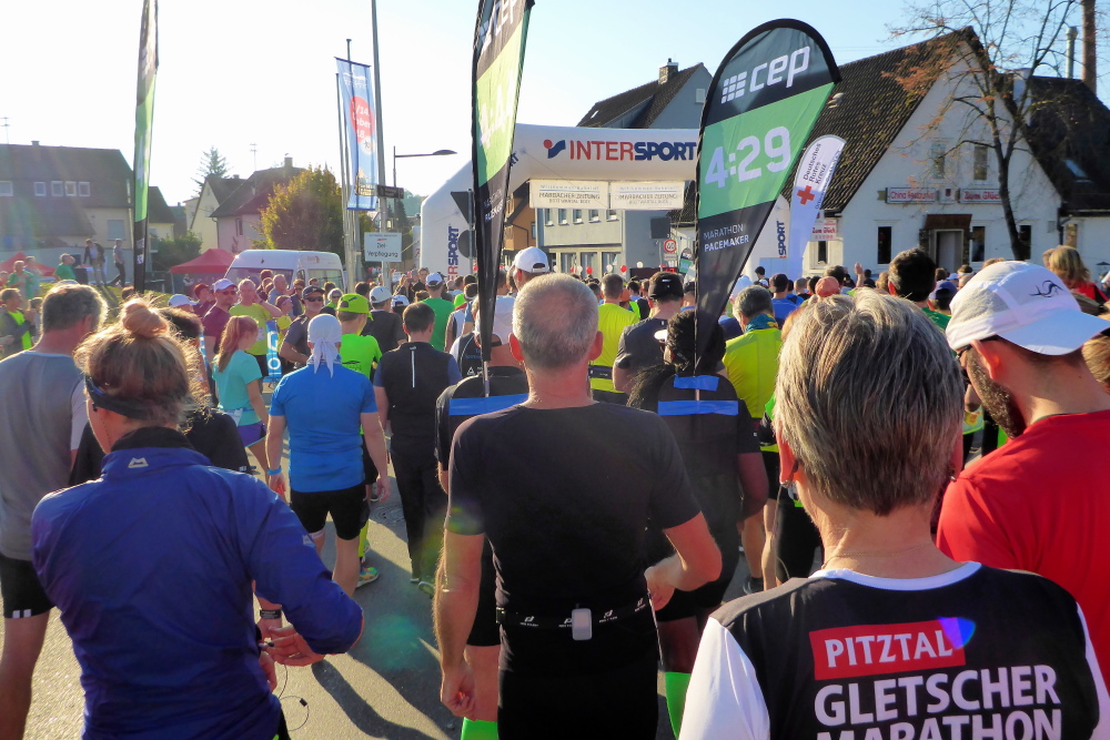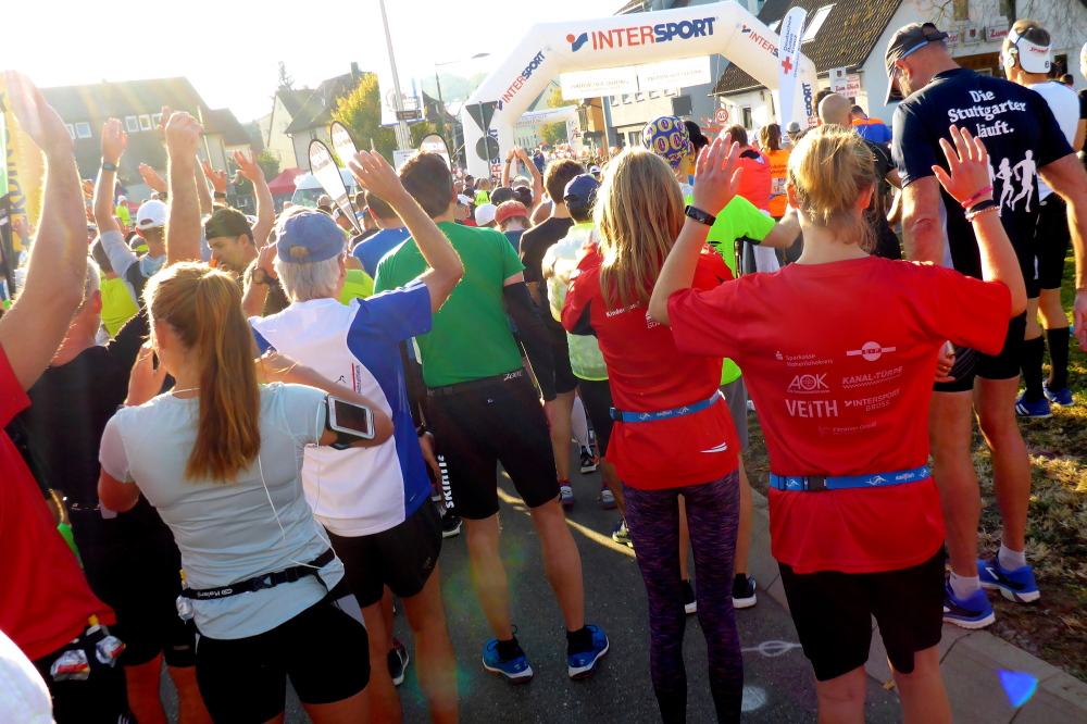 Wir geben unsere Wechselkleidung im dafür vorgesehenen Zelt ab, und machen uns auf den Weg nach unten zum Steppi-Kreisel. Es ist ganz schön frisch, aber der Wetterbericht hat für den Lauftag viel Sonne angekündigt. Vor dem Marathontor sind die Läufer bereits versammelt, und ich bekomme gerade noch mit, wie Michael Sommer, eerfolgreicher Ultraläufer und gerne gesehener Dauergast im Bottwartal, gerade erklärt, warum er nur den Marathon läuft: „Verletzungsbedingter Formaufbau“.