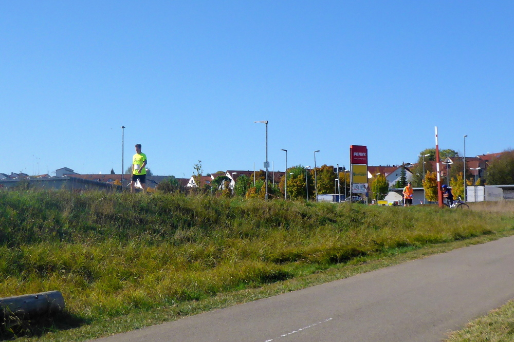 Als Kay-Uwe Müller lachend und winkend vorbei ist, wird es gleich wieder ruhig. Kein weiterer Läufer ist in Sicht. Hinter km 18 verlasse ich den Radweg. Etwas unübersichtlich geht es zwischen Häusern hindurch und ich werde vom Streckenposten darauf hingewiesen, dass nun mit Gegenverkehr zu rechnen ist. Noch bevor ich die Häuser von Oberstenfeld erreiche, kommen mir die führenden Männer des Staffel- und des Teamwettbewerbs entgegen. Zweiter Marathoni ist Günther Seibold, gefolgt von Michael Sommer. Der erste Halbmarathonmann ist auch schon da.