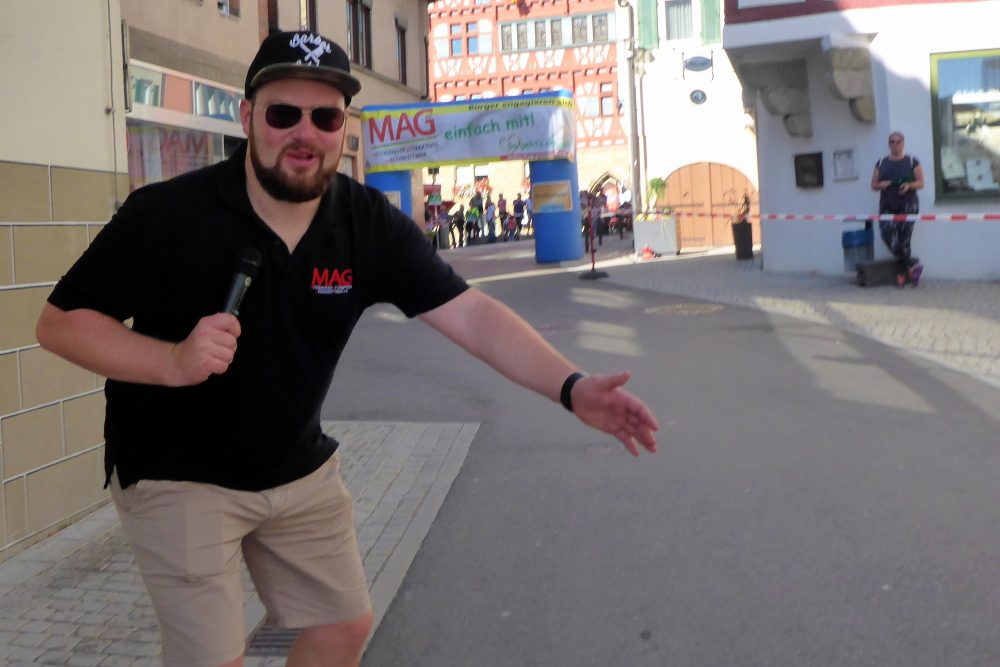 Unten erreiche ich den alten Stadtkern von Großbottwar durch das Steintor. Gleich darauf wartet bereits ein Moderator, der mich überschwänglich empfängt und abklatscht. Hinter einem kleineren Marathontor scheint, zumindest der Lautstärke nach, die halbe Stadt auf mich zu warten. War ich gerade noch müde, bin ich für einen Moment wieder topfit. In den Gassen der Altstadt (km 37) feuern mich an jeder Ecke die Streckenposten an.