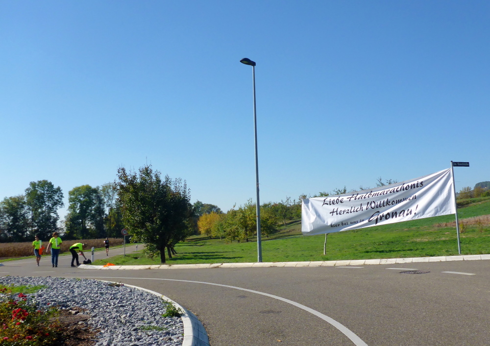 Kurz vor dem km 21 Schild warten die Helfer der VP auf Kundschaft. Appetitlich aufgetürmt gibt es Bananen. Ich gönne mir ein Stück und gleich 2 Becher Wasser und Cola. Dann geht es in den Ort hinein. Direkt hinter dem Abzweig auf die Hauptstraße steht das Starttor, wo der Halbmarathon gestartet wurde. Weil man zunächst eine Schleife läuft, kommen viele Läufer entgegen. Hier sind viele Zuschauer und ein Moderator kommentiert das Geschehen von einer Hebebühne aus. Weil ich fotografiere, bekomme ich viele Daumen hoch und nette Aufmunterungen. Oder sehe ich schon so fertig aus, dass man mir Mut machen will? Ich merke tatsächlich, dass ich ungewollt schneller werde. Das rächt sich aber gleich, am Ortsschild von Gronau bin ich platt.