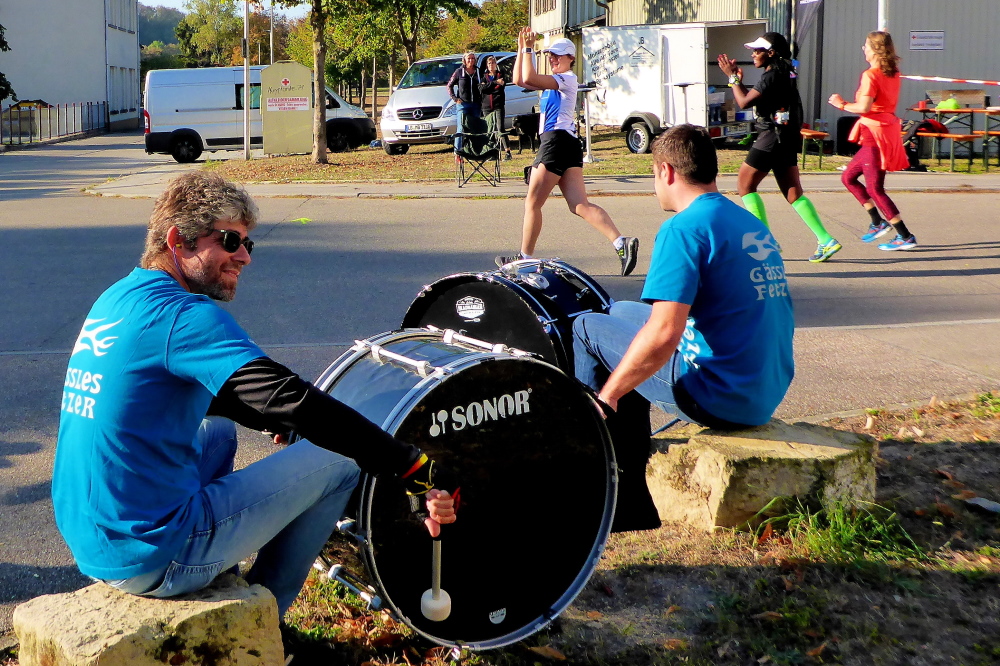 Am schönsten ist aber, dass ich bei km 30 zurück auf der Straße nach Beilstein bin, die mich nach Oberstenfeld führt. Die Straße führt leicht bergab und liegt meist im Schatten. Unten in der Kurve steht wie immer die Percussion-Band, die unermüdlich den Lauftakt vorgibt.