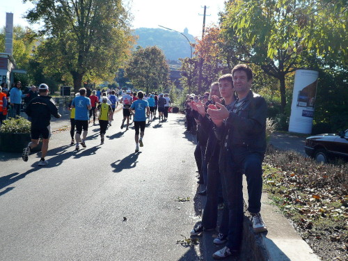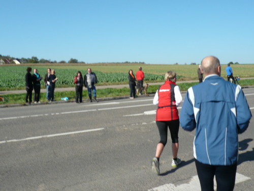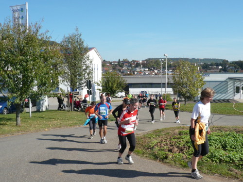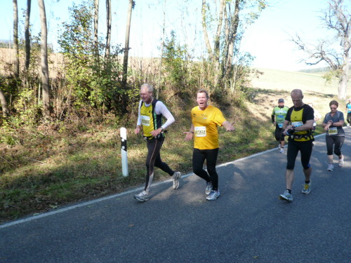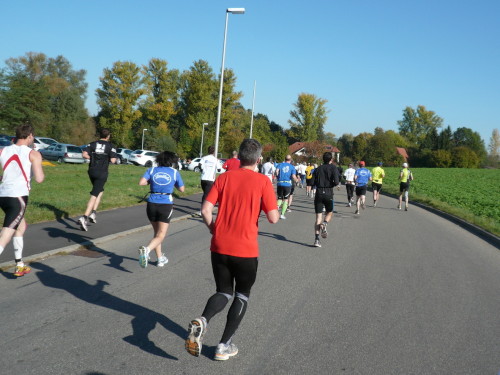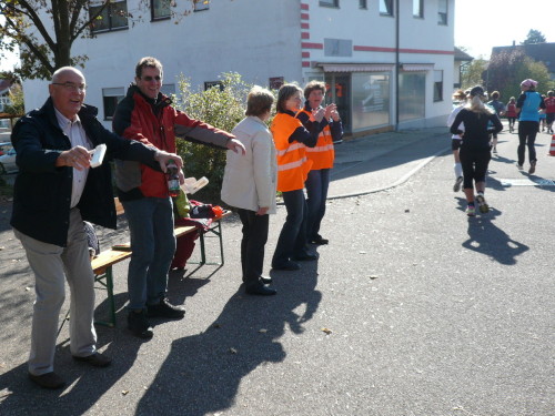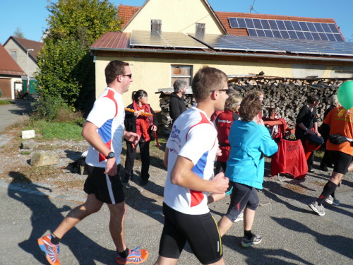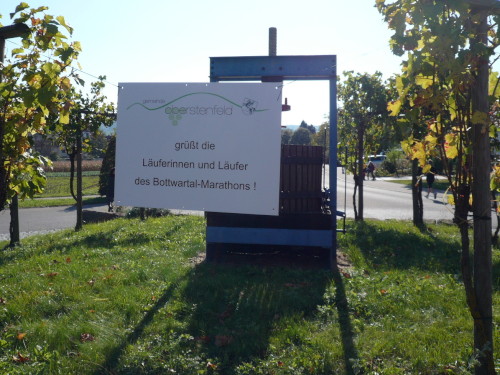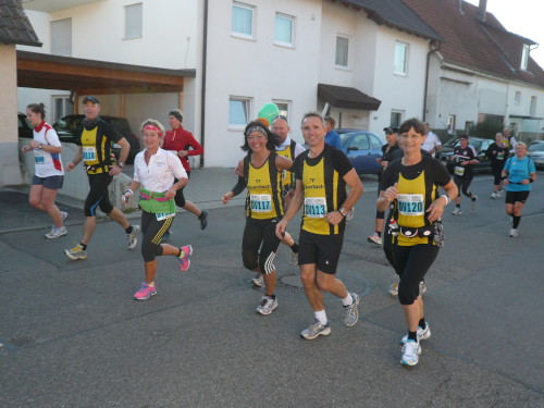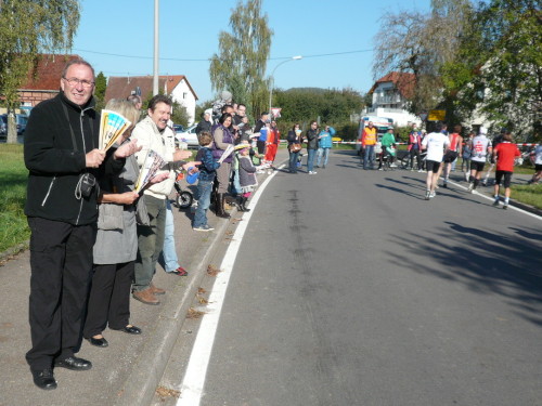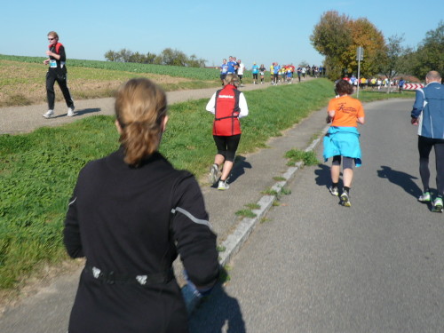 Gemeinsam mit dem Zugläufer für 4 Stunden stehen Peter und ich in vorderster Front des nächsten Blocks. Endlich einmal den Kenia-Blick genießen, freie Sicht auf die Laufstrecke. Auch wir werden mit einem Kanonenschlag auf die Reise geschickt. Ich nehme die Beine in die Hand und hefte mich an die des 4 Stunden-Zugläufers. Nach ein paar Fotos hetze ich Peter hinterher. Noch in Großbottwar bin ich an ihm dran und ziehe sogar vorbei. Ich praktiziere wieder mein geliebtes Fahrtspiel.