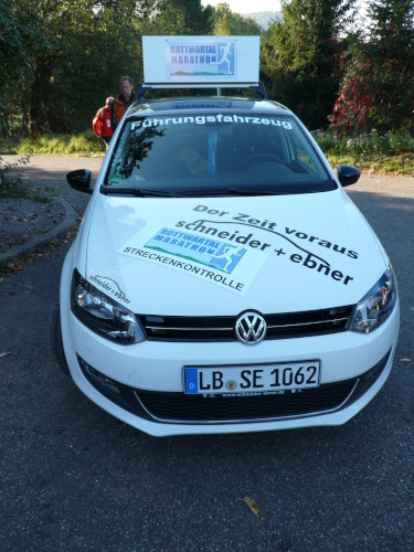 Peter, der auch dieses Jahr wieder den Zugläufer über 4:30h macht, holt mich am Morgen im nahegelegenen Kirchheim am Neckar ab. Eine kurze Autofahrt später erreichen wir einen einsamen Parkplatz, ein Geheimtipp, direkt an der Marathonstrecke und nur zweihundert Meter weg von Start und Ziel. Jetzt kann ich ja von dem Geheimtipp erzählen, nächstes Jahr müssen oder dürfen wir ja nach Steinheim.