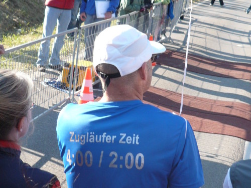 Ich begebe mich in Richtung Startaufstellung und suche, noch außerhalb gehend, die Pole Position mit den schnellen Hasen auf. Durch ein Absperrgitter gesichert kann ich so die besten Läufer bei ihren letzten Startvorbereitungen ablichten. Wie auch Armin Härle, der als Zugläufer für 3:30h an den Start geht und einen hervorragenden Job macht.
