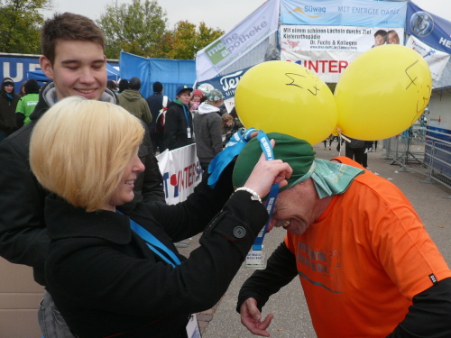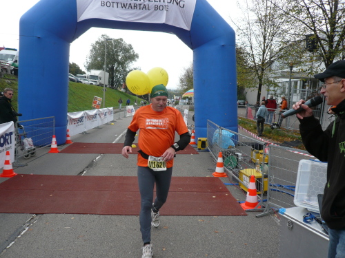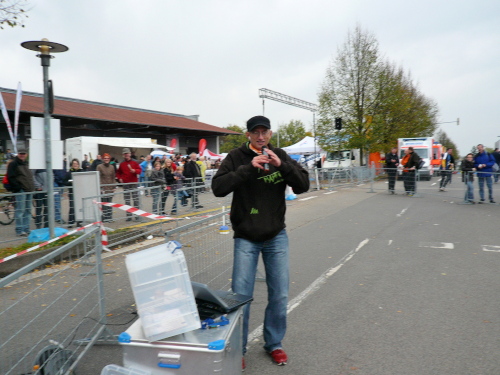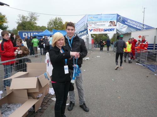 Im Ziel angekommen, beglückwünschte mich auch gleich der Moderator und ließ es sich nicht nehmen, ein Finisher-Bild von mir zu schießen. Kurz darauf überquerte auch Peter in 4:29:30 h die Zeitmessmatten. Perfektes Timing.
