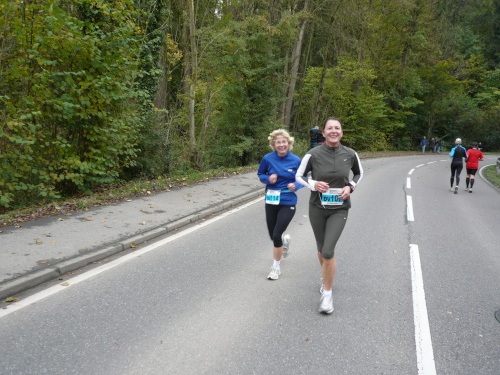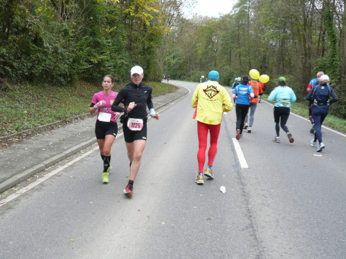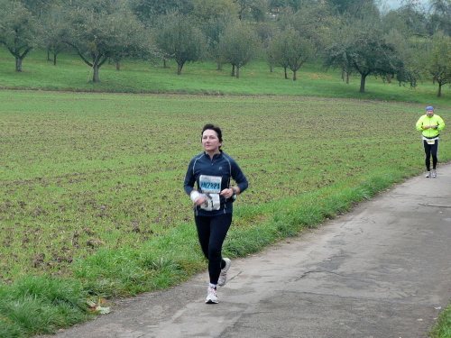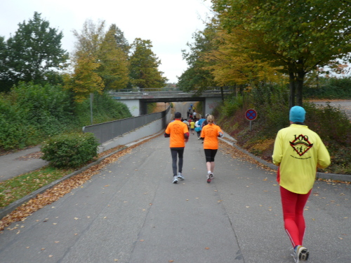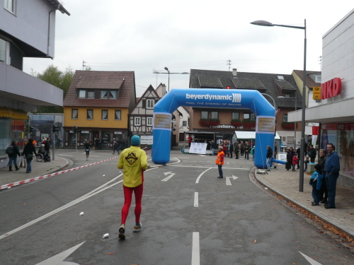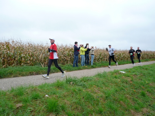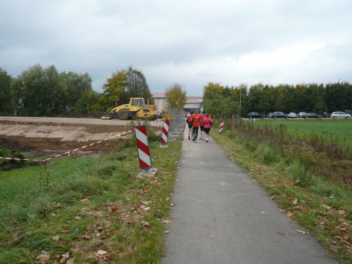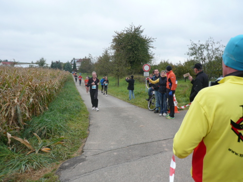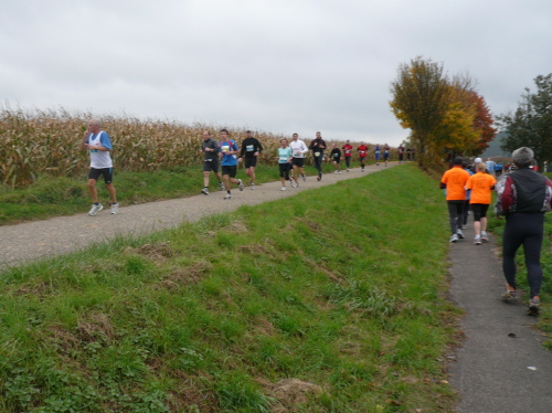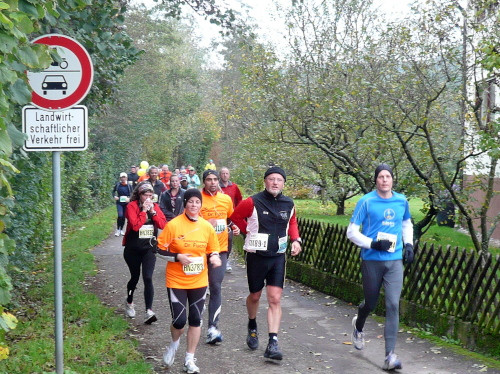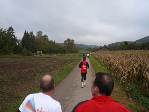 Auf der Straße nach Steinheim begegnete uns bereits die spätere Siegerin Nicole Benning. In Steinheim war dann auch der Wendepunkt für die Dreiviertel-Marathonis, die seither mit uns die Strecke teilten. Nach einem Rechtsschwenk verließen wir die Begegnungsstrecke.