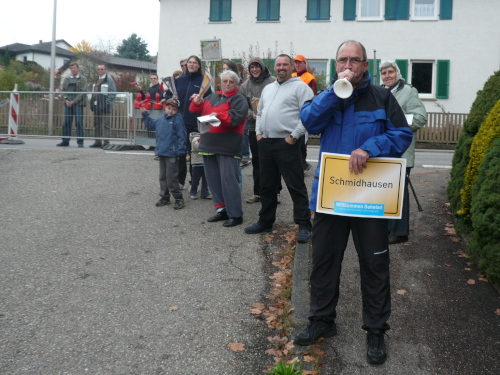 Auf leicht welligen, aber stets gut zu laufendem Terrain erreichten wir Gronau, wo wir von einem Moderator in der Bütt lautstark begrüßt wurden. Auch hier war die Stimmung am Überkochen. Wir liefen auf einem Feldweg vorbei an Schmidhausen zum vorerst nördlichsten Punkt der Strecke. Eine kleine Schleife führte uns wieder südwärts nach Schmidhausen.