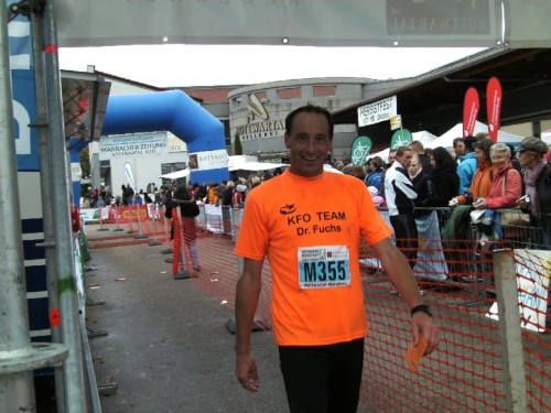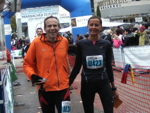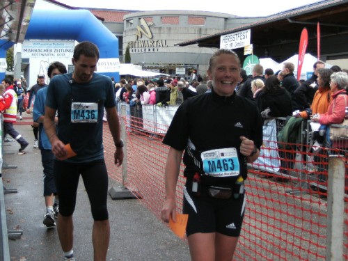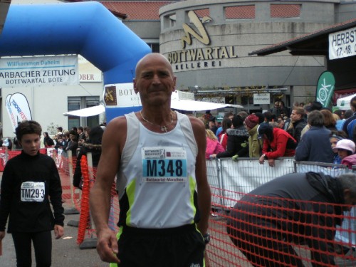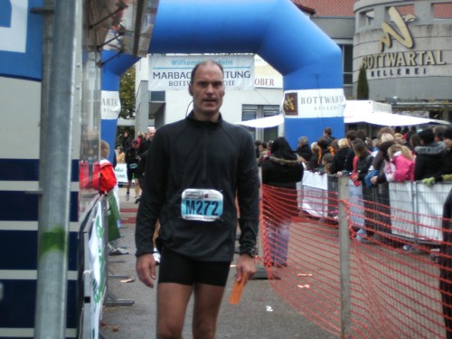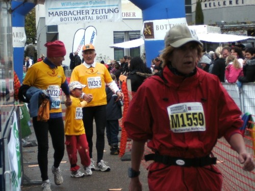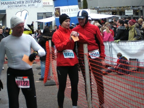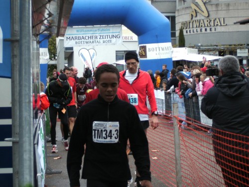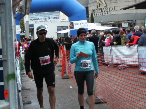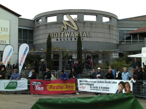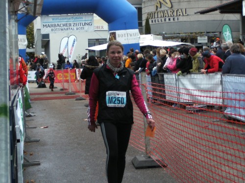 Es geht schnurstracks zum Ziel der Halbmarathonis an der Bottwartal-Kellerei. Die Halbmarathonis haben ihr Tempo mithin gesteigert. Wir laufen auf die Kellerei zu, biegen am Betriebsgelände rechts ab, die Halbmarathonis durchlaufen kurz danach das Zielbanner links, während wir uns rechts einordnen müssen. Die roten Zeitmessmatten nehmen auch meine Zeit. Beim Blick auf die Uhr sehe ich etwas mehr als 1.30 Stunden. Einen Schub verschafft mir der Moderator mit den Worten: „Der läuft in der Meisterschaft ganz vorne mit.“