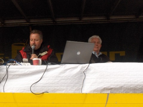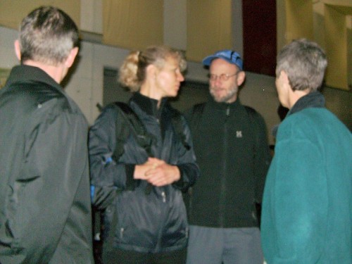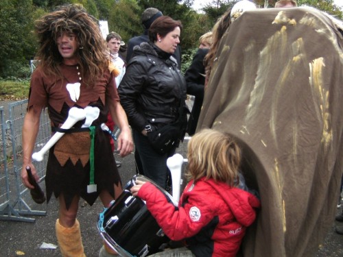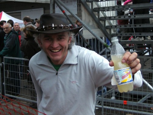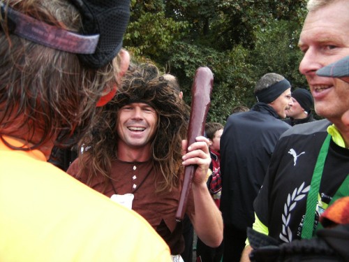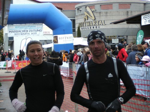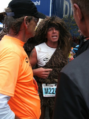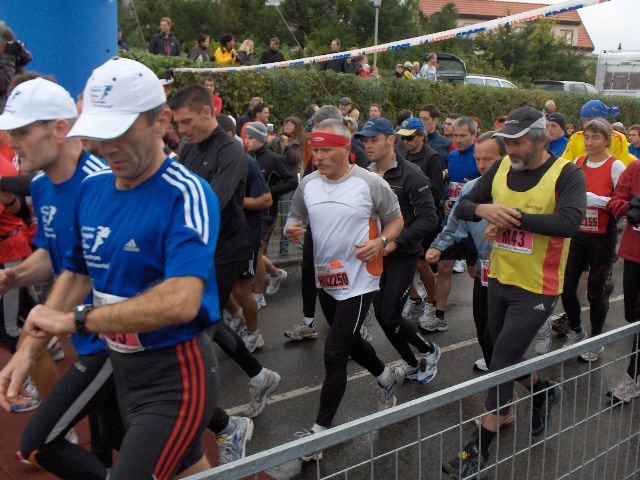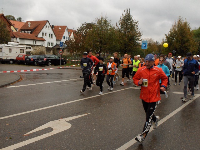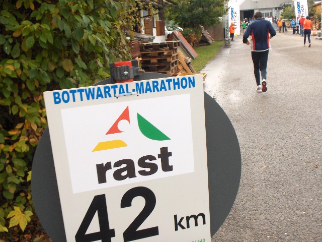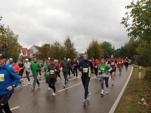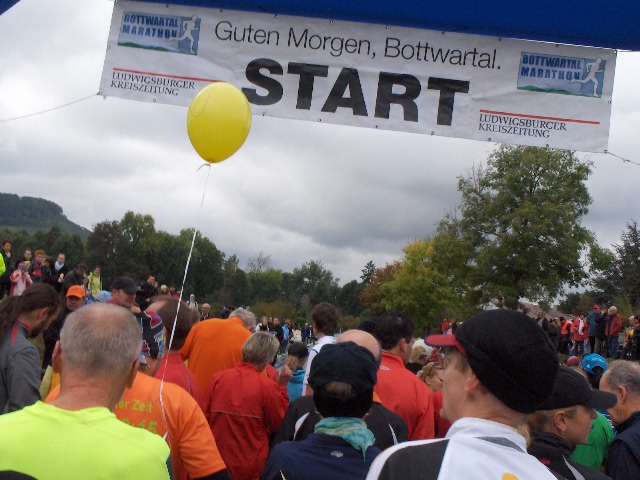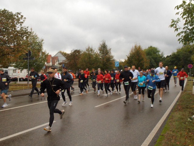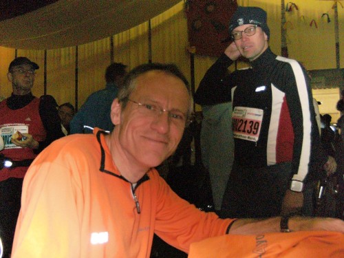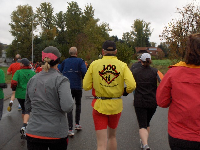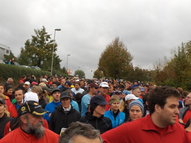 Als ich etwa 30 Minuten vor dem Start die warme Halle verlasse, hat sich das Wetter noch nicht gebessert. Bedeckt ist es und etwa sechs, sieben Grad wird das Thermometer anzeigen. Nach der Kleiderabgabe im Keller der Kellerei laufe ich mich kurz ein und suche noch ein Gebüsch für ein Geschäft. Zurück am Startplatz bemerke ich, dass es pressiert, denn der Moderator kündigt den Start in drei Minuten an. Mit Drängelei komme ich dann noch in den Block der Roten. Das sind die Schnelleren. Es gibt noch Blaue und Grüne. Gab’s am Abend auch Blaue, die Ärger mit den Grünen bekamen? Nun, die Blocks starten dann im Fünf-Minuten-Abstand. So gibt es keine Drängelei auf den später engeren Rad- und Wanderwegen.