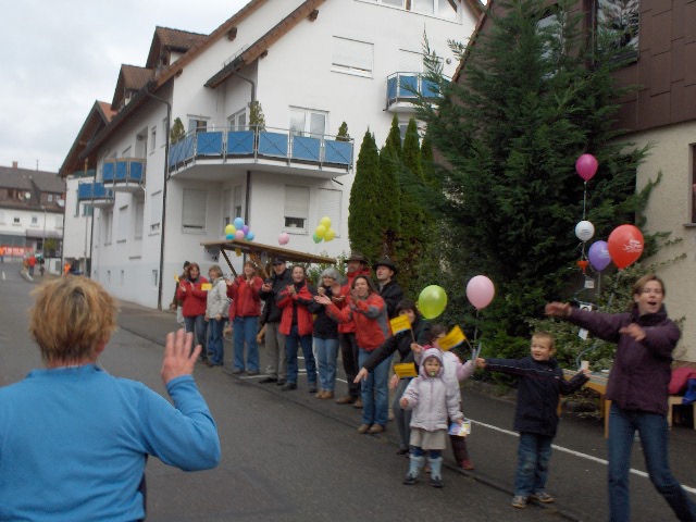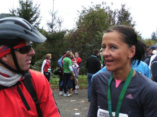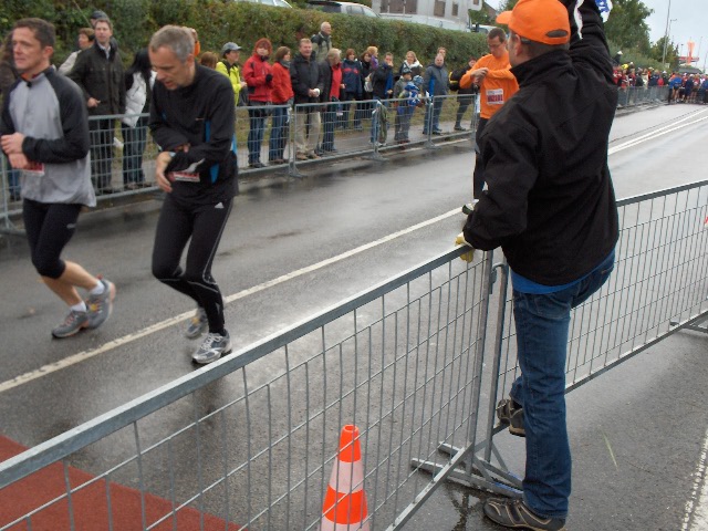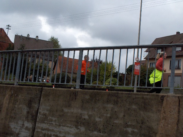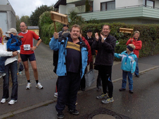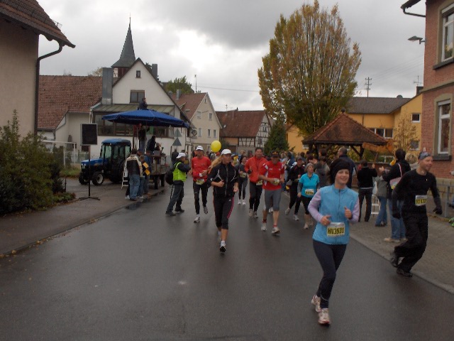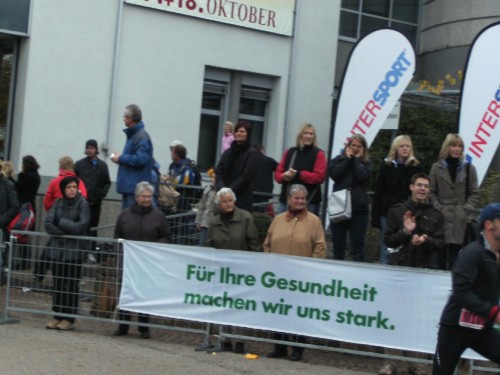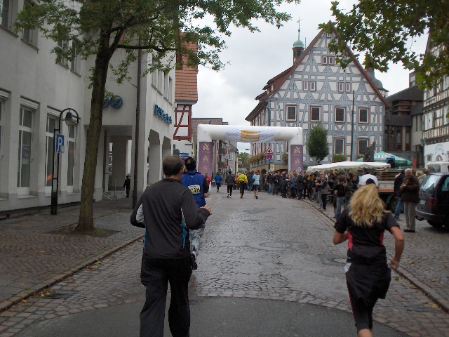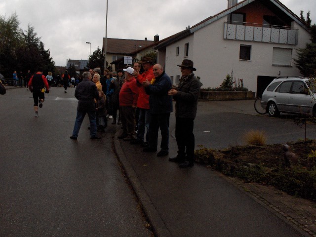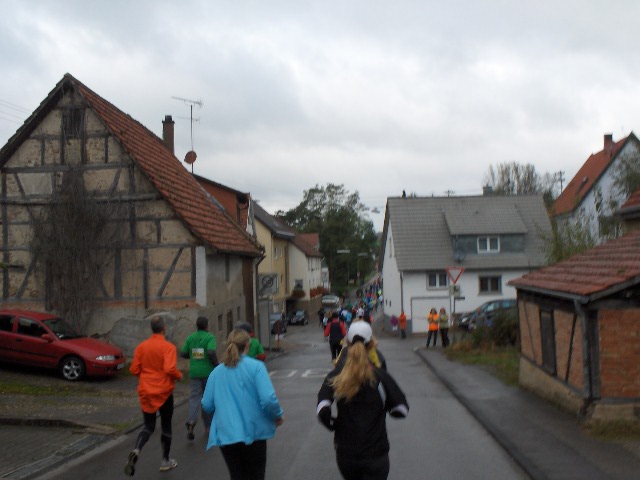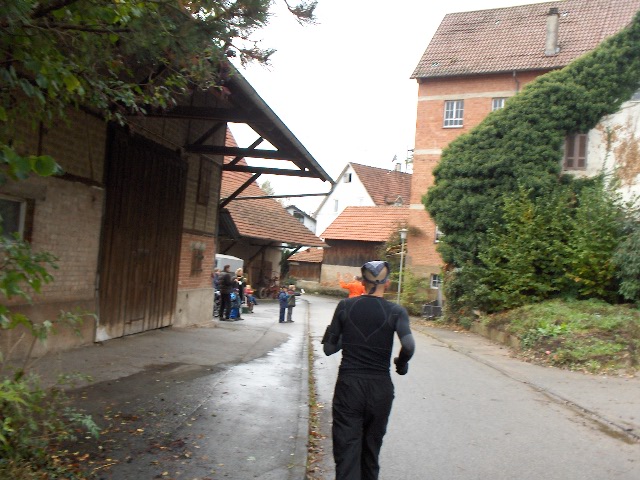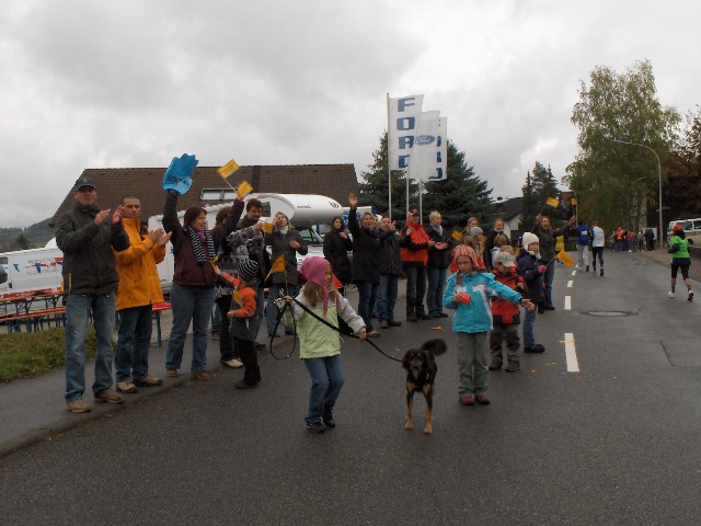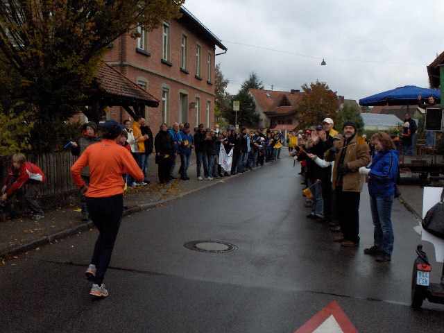 Kilometer eins, ich schaue auf die Uhr und sehe gerade vier Minuten Laufzeit. Eindeutig zu schnell. Also defensiver. Nach wenigen weiteren Minuten laufen wir in den Ort Hof hinein. Nicht nur hier, sondern in allen Ortschaften stehen viele Zuschauer am Rand und feuern uns an. Mit Händeklatschen, mit kleinen und großen Ratschen, mit Kochtöpfen, Blecheimern und was sonst noch dazu taugt, damit werden mir weitergetrieben.