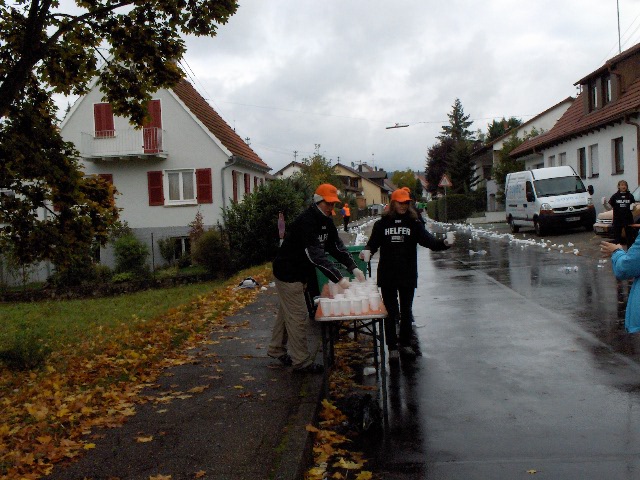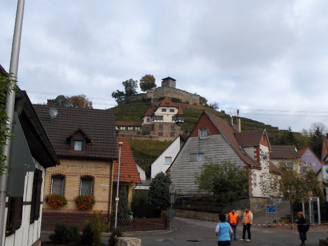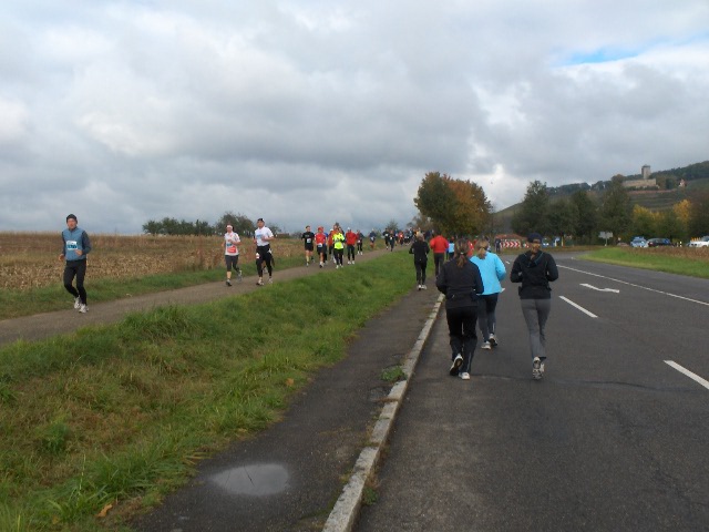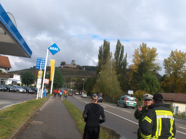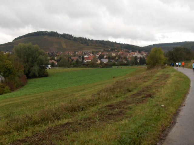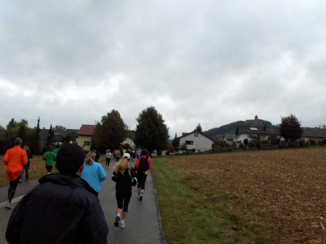 Es geht wieder zurück nach Oberstenfeld, aber sogleich führt dann der Weg Richtung Beilstein. Dort laufen wir direkt auf die hoch oben liegende Burg Hohenbeilstein zu. Diese wurde im 12. Jahrhundert von den Hohenstaufern errichtet. Der Anblick ist wunderbar. Ein paar Meter weiter in der Ortsmitte ist wieder die Stimmung der Zuschauer auf dem Siedepunkt. Mit La-Ola-Wellen wird jeder Läufer weitergetrieben. Mir gefällt besonders, dass immer wieder Musikkapellen aufspielen und die Moderation in einigen Orten. Immer wieder werden die Läufer namentlich angesprochen.