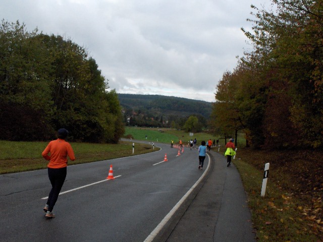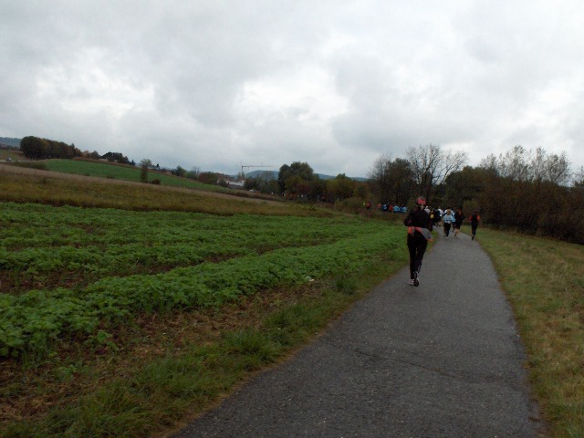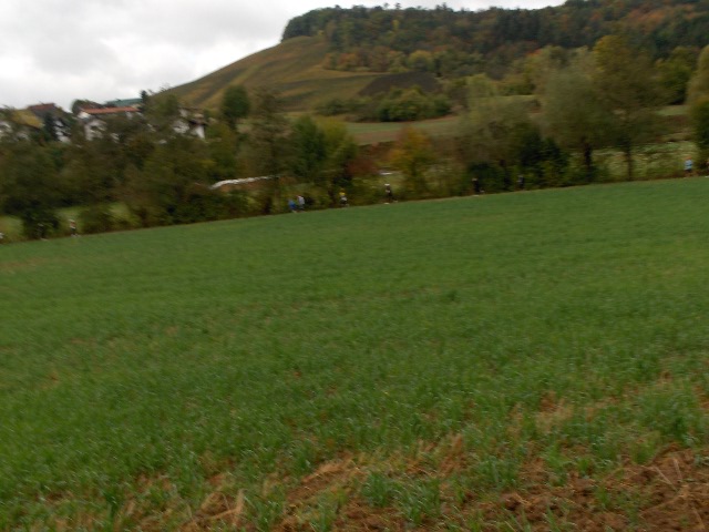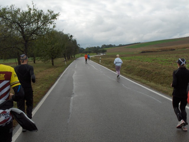 In Gronau führt uns der weitere Weg in einer Schleife durch den Ort und durch angrenzende Felder, dann geht es nordwärts nach Schmidhausen. Bei Kilometer 10 checke ich wieder die Zeit, jetzt passt es genau für drei Stunden Laufzeit. Das ist aber ein Ziel, dass mir auf dieser nicht einfachen Strecke fast unerreichbar erscheint. Die Nordschleife hat rund 120 Höhenmeter, die im Süden etwa 90 Höhenmeter. Zusätzlich gibt es sehr viele Richtungswechsel, wo Konzentration aufgrund des feuchten Untergrundes, evtl. Laub oder Dreck auf der Piste erforderlich ist. Ein Ausrutschen kann ja unter Umständen sogar ein Aus bedeuten.