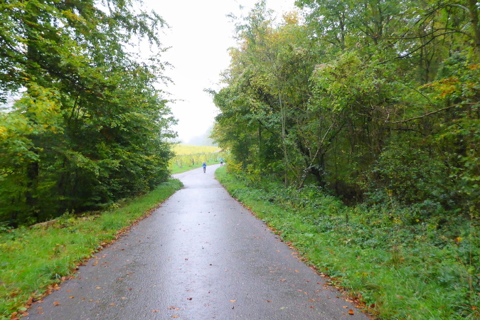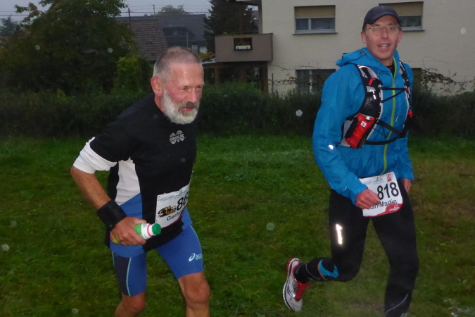 Die Zeitmessung erfolgt für jeden Läufer separat mit dem in der Startnummer eingearbeiteten Transponder. Gleich nach dem Start halten wir uns links und laufen die Kleinbottwarer Straße hinauf. Wir verlassen den Ort. Nach ca. einem Kilometer geht es rechts auf einen geschotterten Feldweg die Böschung hinauf. Gerhard Petermann selbst verabschiedet hier die Läufer. Unvermittelt erreichen wir eine weite Fläche, die mit Reben bepflanzt ist. Es geht die Forsthofstraße entlang. Der Nebel hängt tief. Weiter führt die Strecke rechts zwischen Feldern hindurch in einer großen Schleife, bis wir fast wieder die Forsthofstraße erreichen.