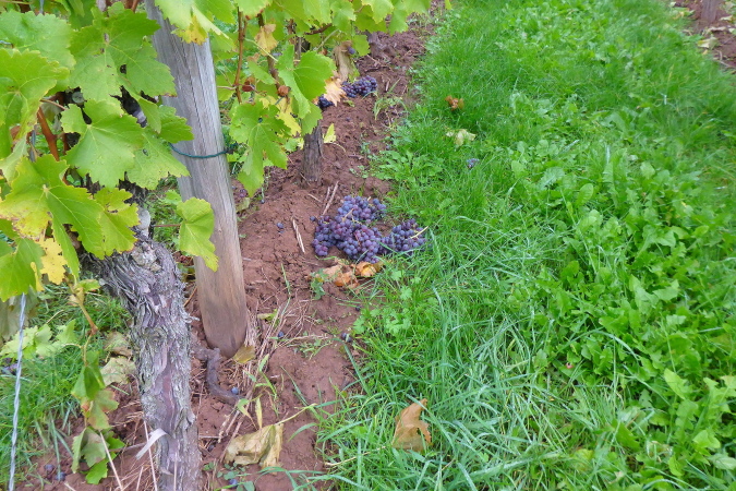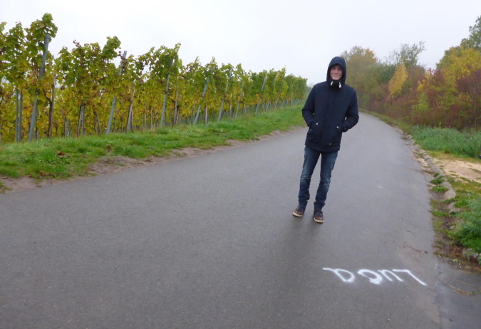 Der junge Mann an der VP bei km 13 ist guter Dinge. Die Läufer kommen genau so, dass ihm nicht langweilig wird. Pfeile zeigen scharf links. Die Straße geht relativ flach geradeaus. Wir laufen auf halber Höhe zwischen den langen Rebenreihen entlang. Die Läufer vor mir sind nicht zu sehen, so dass ich Muse habe, um nach Trauben Ausschau zu halten. Tatsächlich hängen hier große, pralle Früchte am Weinstock. Aber die sind sicher nicht für den Verzehr gedacht. Hier wartet Spätlese oder sogar Eiswein auf den optimalen Erntezeitpunkt.