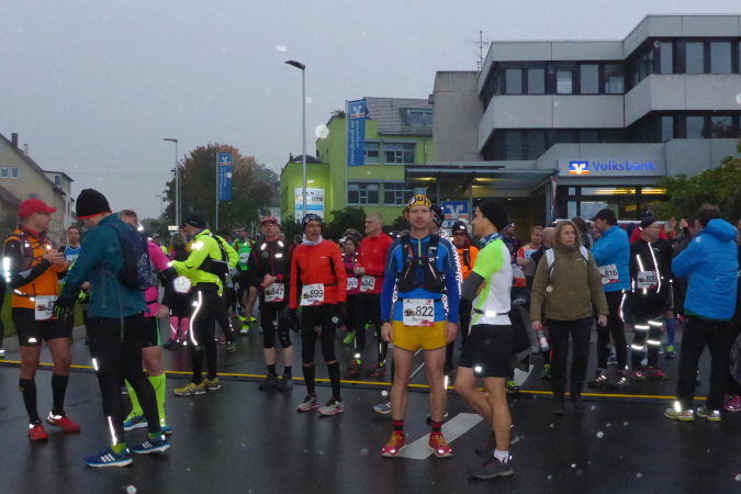Weil der Start des Ultras um eine halbe Stunde nach vorn verlegt wurde, ist das Parken vor der Halle für uns kein Problem. Drinnen sind die Langstreckler noch unter sich. Man trifft Bekannte und kann noch ein kleines Frühstück einnehmen. Eine Marathonmesse bietet diverse Laufutensilien, während die Helfer an den Schaltern entspannt dem kommenden Ansturm harren. Zur Startnummer erhalten wir eine Flasche Wein, mit dem Aufdruck des Steppi, dem neuen Wahrzeichen von Steinheim. Anstatt des obligatorischen Shirts gibt es eine hochwertige Mütze und noch ein Fläschchen Bottwartaler Wein. Während wir uns vorbereiten, gibt der Sprecher noch einige Informationen. Ich bin unkonzentriert und bekomme nichts mit.