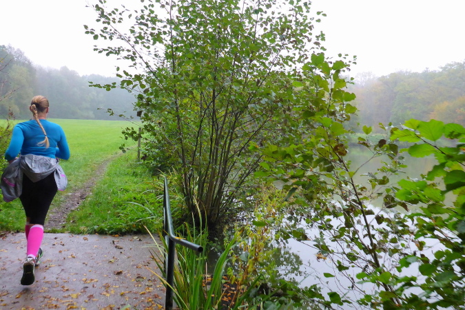 Mit Beate habe ich eine gleichschnelle Laufpartnerin gefunden, die Zeit vergeht wie im Flug. Irgendwann führt die Strecke längere Zeit bergab; wie immer lasse ich es laufen, so dass ich leider meine nette Laufbekanntschaft verliere. Vor mir ist ein Läufer in blauer Jacke, da komme ich aber nicht heran. Hinter mir ist niemand. Ich versenke mich in den Läuferflow bis ich vor mir Autoverkehr höre. Hier heißt es aufgepasst. Kurz bevor ich die L1115 erreiche, führt eine steile Steintreppe zu einem Kanal hinunter. Ein dunkler schmaler Tunnel bringt mich unter der Straße hindurch und auf der anderen Seite mit einer weiteren Treppe wieder hinauf. Gabi, eine hübsche Läuferin mit Zopf, überholt mich. Leider kann ich nicht dranbleiben. Sie ist mir einen Tick zu schnell und es hat keinen Sinn, jetzt schon Körner zu verpulvern.