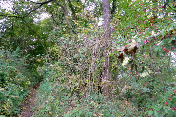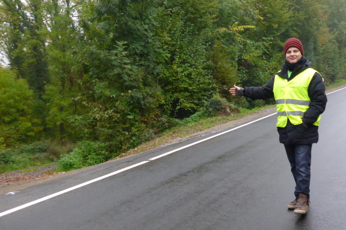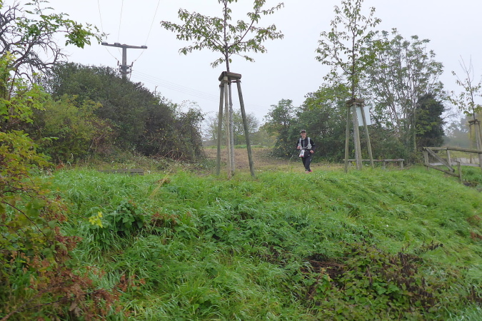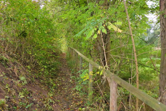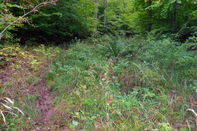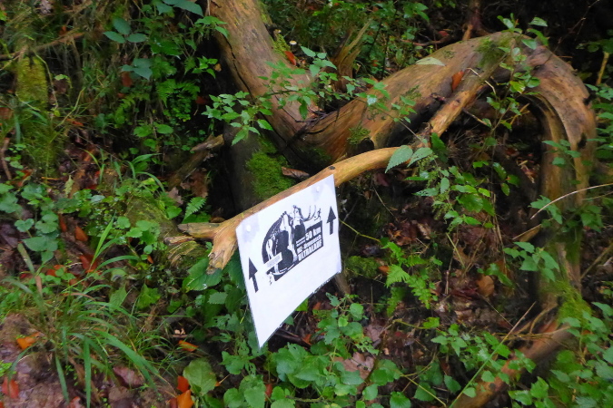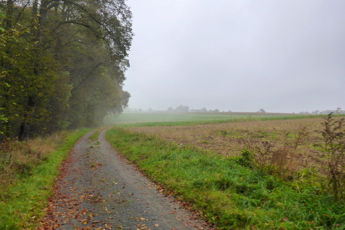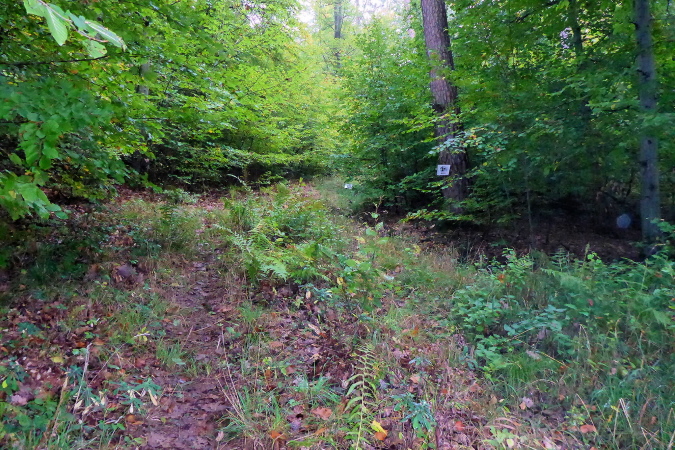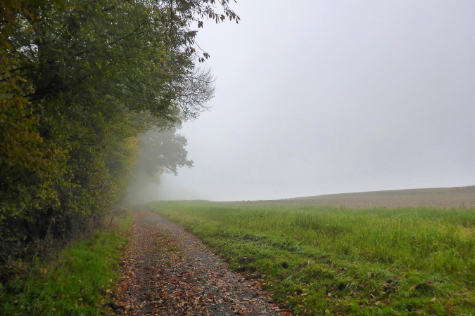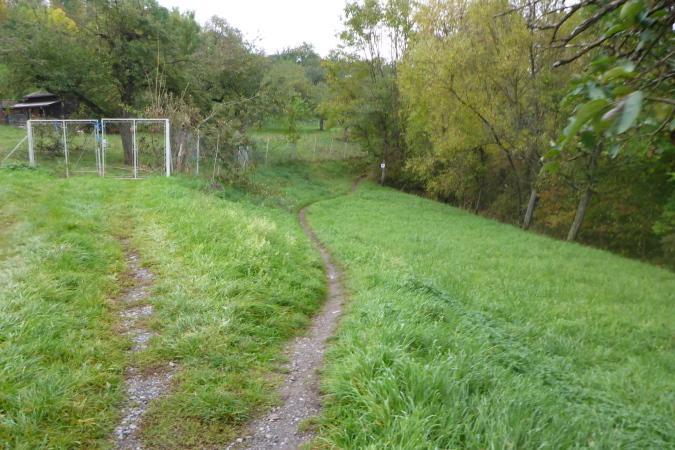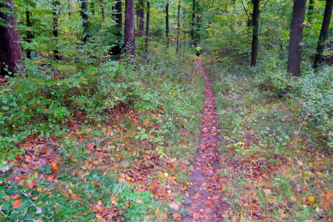 Wir streifen kurz Hof und Lembach, wo Sven wartet und uns nach scharf links weist. Über die Felder geht es in den Wald zurück. Ein breiter Schotterweg bringt uns erst bergauf und dann wieder bergab. Wir sind im Gespräch vertieft als plötzlich Pfeile nach links zeigen. Wo geht es hier weiter? Wenn das früher einmal ein Weg gewesen ist, dann ist jetzt davon nicht mehr viel übrig. Wir orientieren uns an den Schildern, auf denen Steppi uns den Weg weist. Diese sind nun immer in Sichtweite angebracht, damit wir die Richtung nicht verlieren. Es geht bergauf durch niedriges Gestrüpp. Ich genieße diese direkte Begegnung mit der Natur. Meine Beine werden langsam wieder lockerer. Ich erkenne vor mir einen kleinen Trail und vergewissere mich bei Marcus, dass die Richtung noch stimmt. Dann flitze ich bergab. Ein wilder Ritt beginnt - über Wurzeln und Steine geht es hinab. Leider verliere ich dabei mal wieder meinen Begleiter. Unten erwartet mich Streckenposten Fipps. Er weist auf einen Grasweg, der immer noch bergab geht. Nach einer Linkskurve und ich komme auf einer Landwirtschaftsstraße durch einen großen Bauernhof.