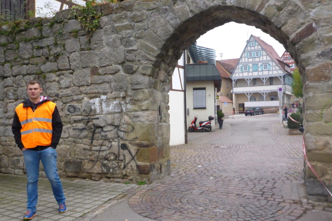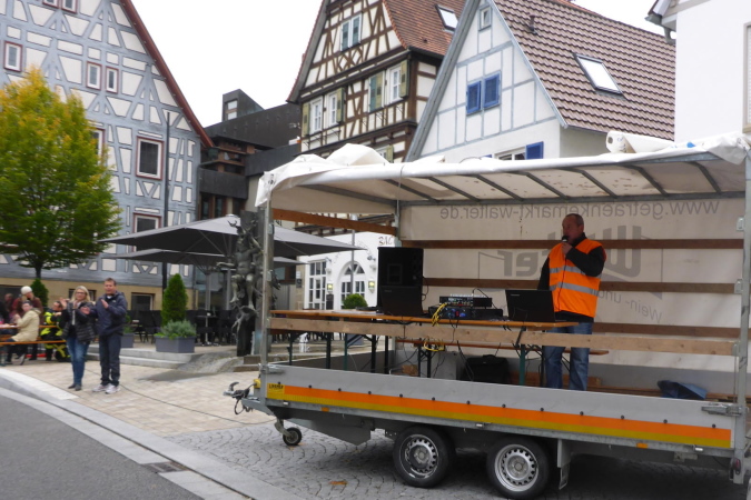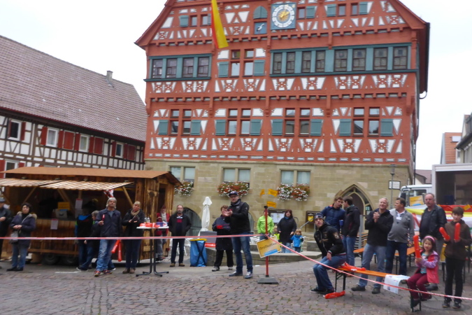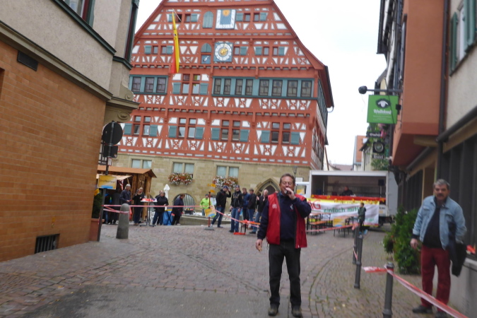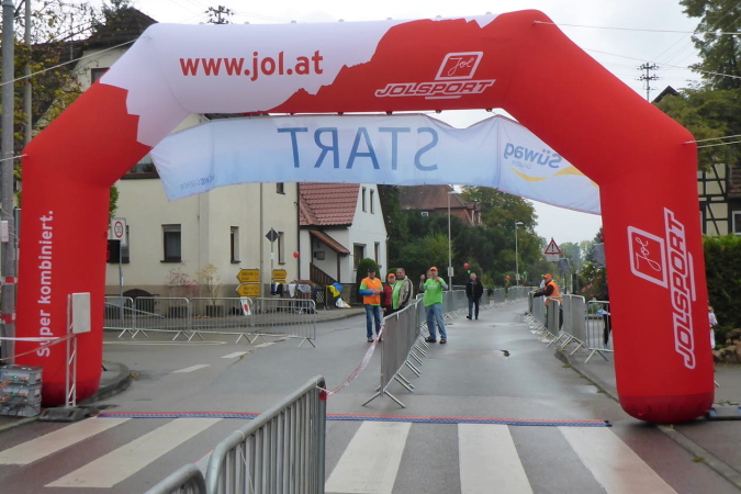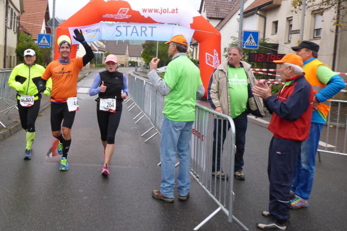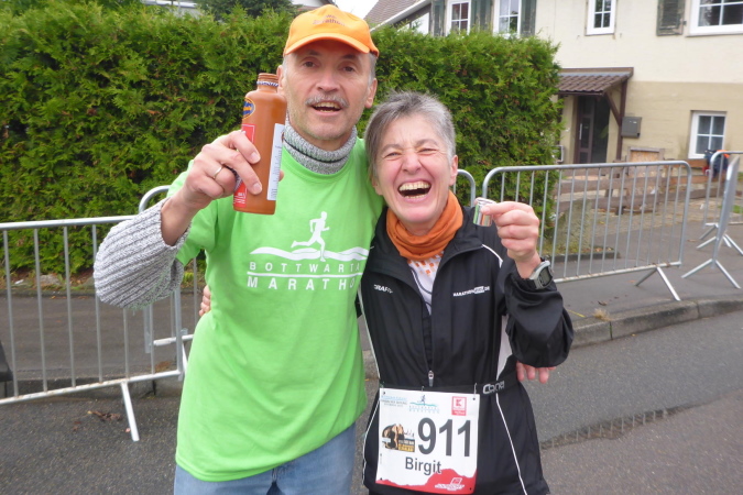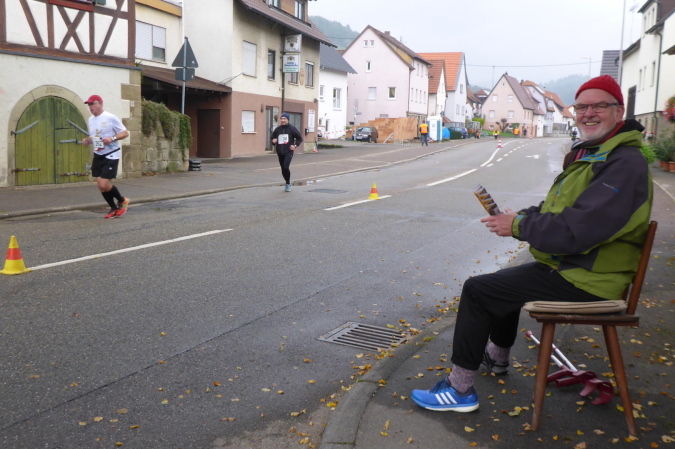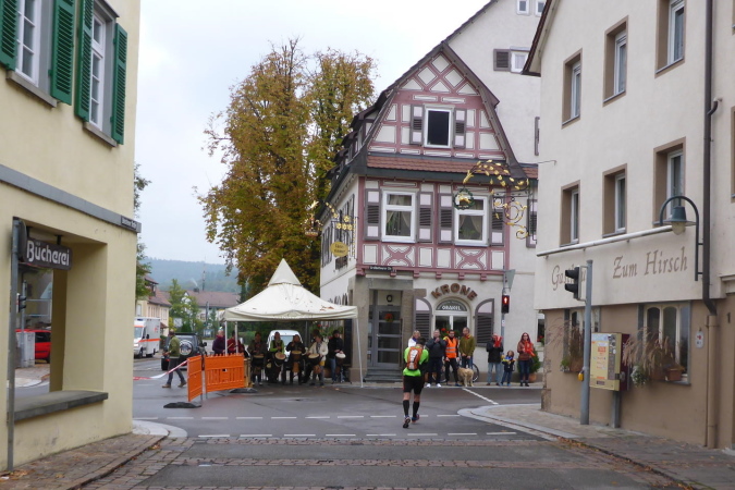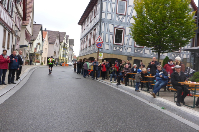 Wer den Lauf von den Anfangsjahren kennt, wird sich noch an die kleine Steigung erinnern. Hier war früher der Zieleinlauf. Wir werden von Streckenposten auf die gesperrte L1100 / Kleinbottwarer Straße geleitet. Es geht bergab. Ich überhole zwei Läuferinnen aus einem anderen Wettbewerb. Beide sind müde, aber fröhlich. Als Lauffreund Ulli von hinten heran gelaufen kommt, bietet eine der Damen an, von uns beiden ein Foto zu machen. Ich achte darauf, dass es so aussieht, als ob ich vorne wäre. Lachend fallen wir uns in die Arme. Es geht weiter bergab, bis wir rechts den Eingang zur historischen Altstadt erreichen. Gemeinsam durchlaufen wir das kleine Tor in der Stadtmauer. Großbottwar hat eine wunderbare Altstadt. Und wenn sie dann auch noch so belebt ist, wie heute, ist das doppelt schön. Sprecher und Publikum erwarten uns auf dem Marktplatz mit dem historischen Rathaus. Vor allem wir Ultras werden heftig gefeiert. Es geht rechts durch stillere Gässchen, bis wir wieder auf der breiten Kleinbottwarer Straße landen. Diese müssen wir überqueren; noch einen Schlenker durchs Wohngebiet und wir erreichen die nächste VP.