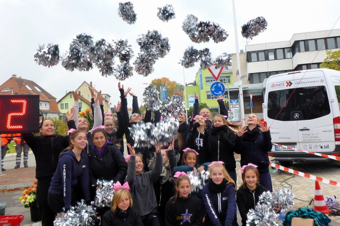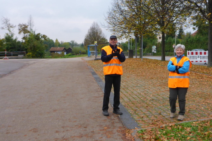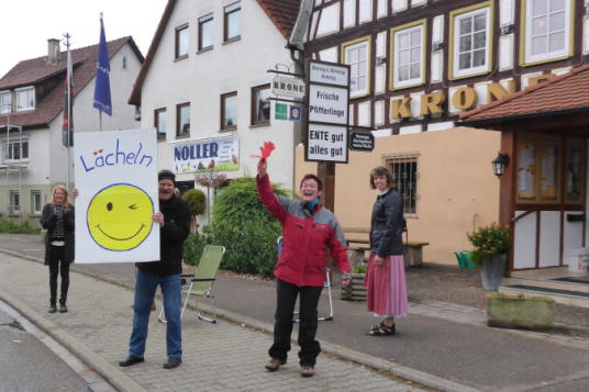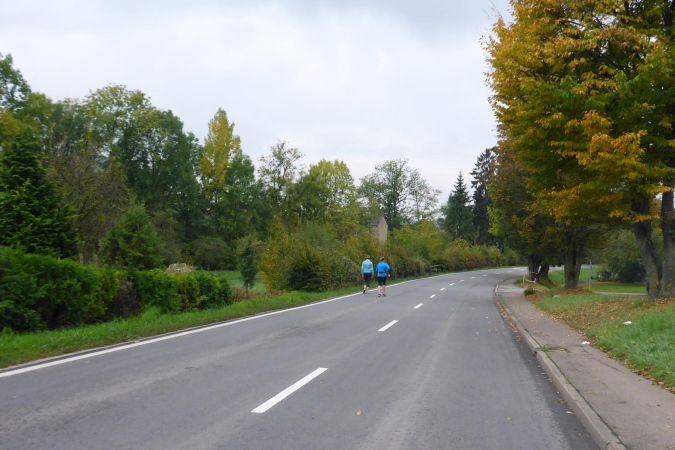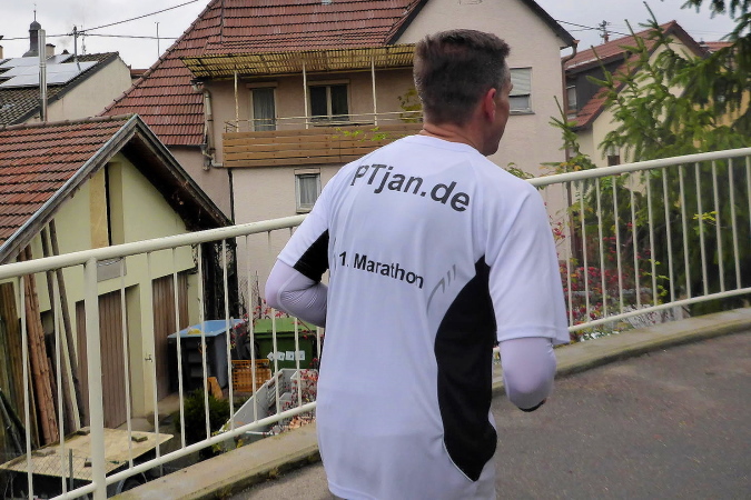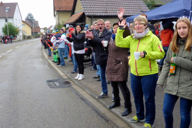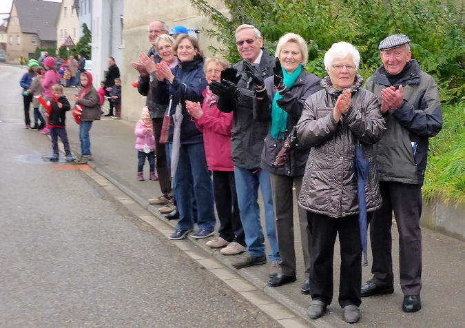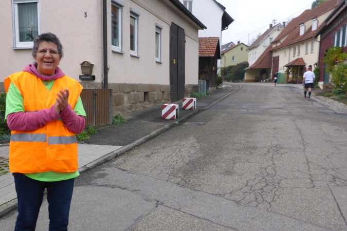 Auf einem flachen Radweg kommen wir nach Kleinbottwar. Der kurze Anstieg zu den ersten Häusern ist unsere letzte Gehpause. Es geht mitten durch den Ort. Natürlich steht hier wieder Publikum. Aber die Guggenmusik macht gerade Schluss und die Musikanten sind am Aufbrechen. Trotzdem werden wir noch einmal extra angefeuert. Wir erkennen die Straße nach Steinheim, auf der vor einigen Stunden alles begann. Obwohl wir nur in moderatem Tempo unterwegs sind, können wir noch mehre Läufer einsammeln. Dann endlich erreichen wir das Ortsschild von Steinheim. Die Kleinbottwarer Straße ist verwaist. Doch hin und wieder ruft jemand „Oh, da kommen Steppis“ und beglückwünscht uns mit Applaus. Rechts der Straße ist eine Fangruppe am Feiern. Wir bedanken uns nur über die nette Anfeuerung.