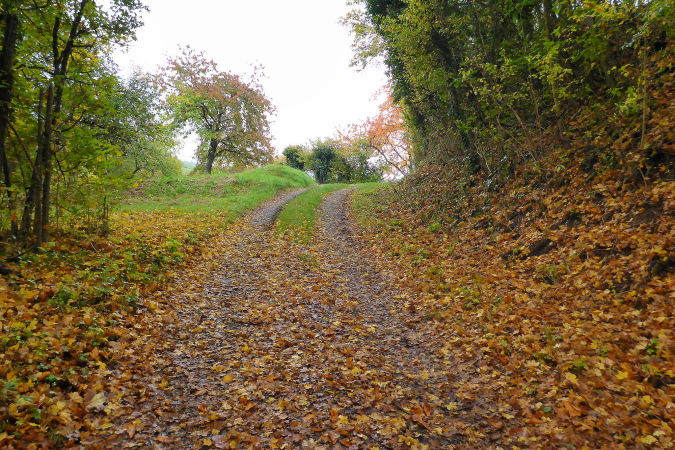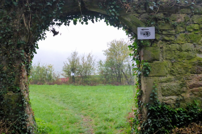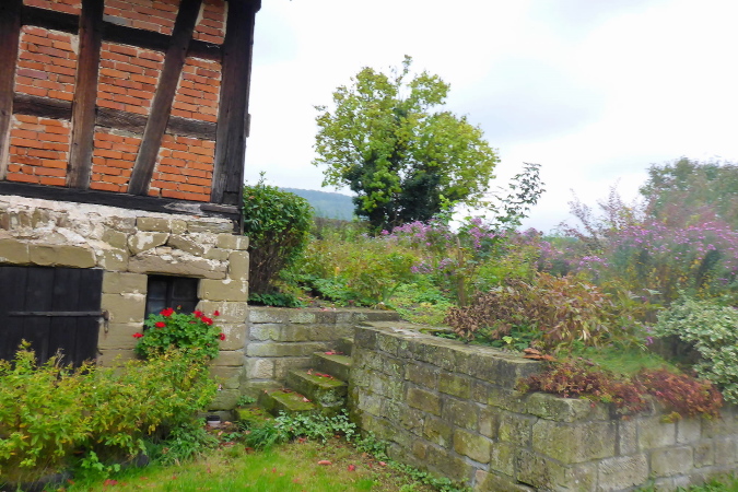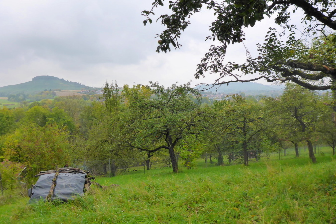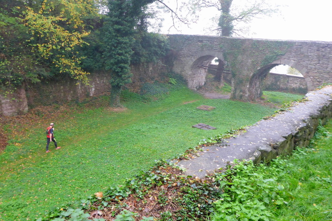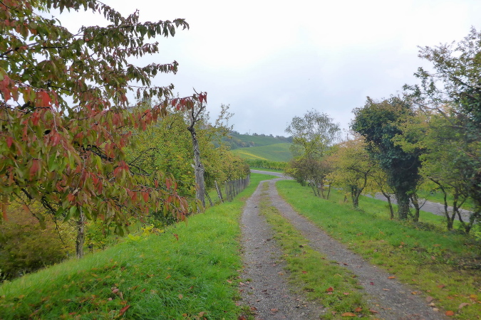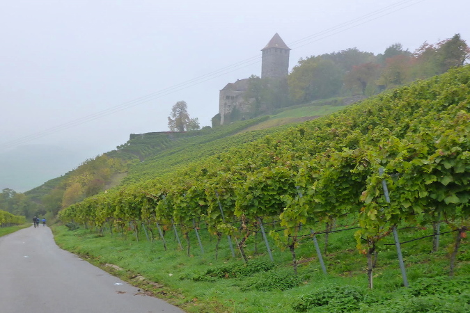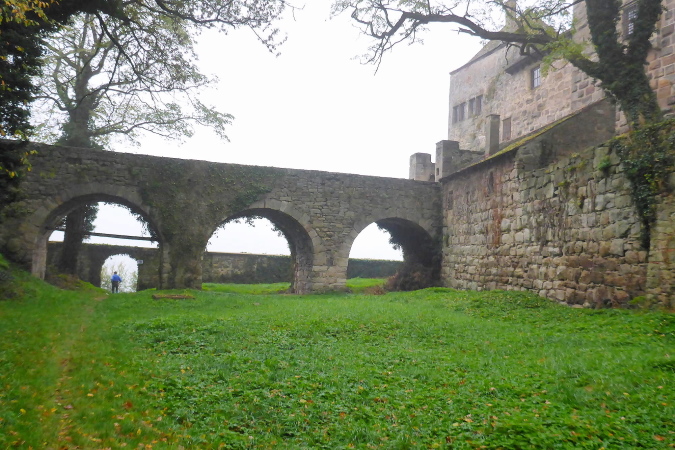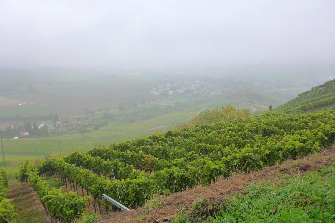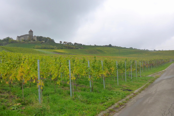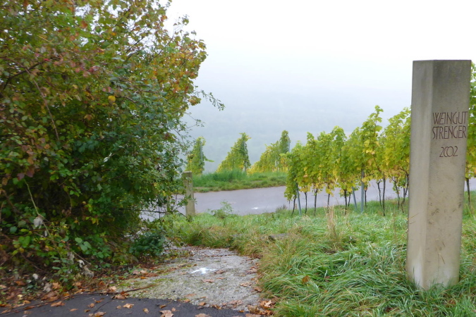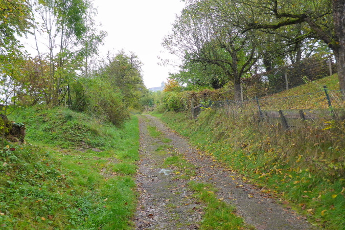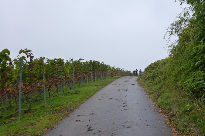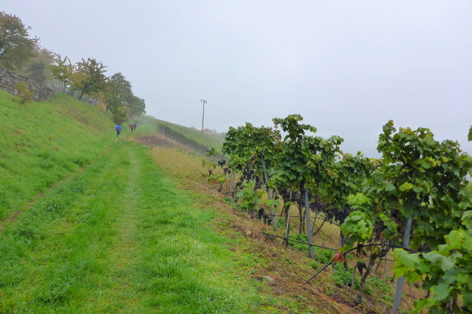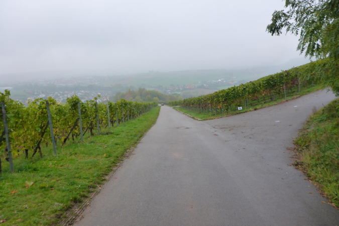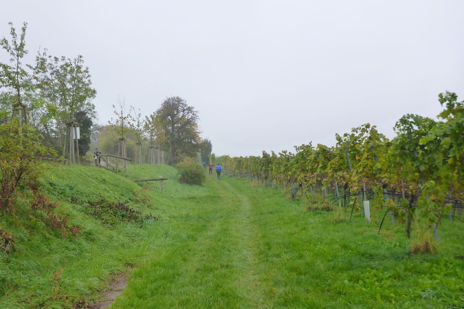 Gemeinsam erreichen wir die Burg Lichtenberg. Heute ist der Burghof wegen einer geschlossenen Gesellschaft nicht geöffnet. Die VP liegt geschützt im Torbereich. Wir bedienen uns ausgiebig. Es ist gerade 11 Uhr und wir haben bereits 20 Kilometer geschafft. Eine schmale Treppe führt auf einen Pfad in den Burggraben. Hier knickt der Weg scharf rechts und unter dem Weg hindurch, auf dem wir vorhin gekommen sind, der eigentlich eine steinerne Brücke ist. Diesmal halten wir uns scharf links. So gelangen wir auf einem Wiesenweg oberhalb des Burggartens, der führt parallel zu dem vorherigen Weg wieder zurück. Das wird mir aber erst bewusst, als dort Ulli mit seiner auffällig gelben Jacke auftaucht. Zusammen haben wir schon unzählige Schlachten geschlagen. Heute ist er kurz hinter mir. Ich schaue genauer hin und bemerke jetzt auch Beate, meine Begleiterin vom Anfang. Ein schneller Gruß, dann biegt die Strecke rechts auf eine kleine Treppe, die steil den Weinberg hinunter führt.
