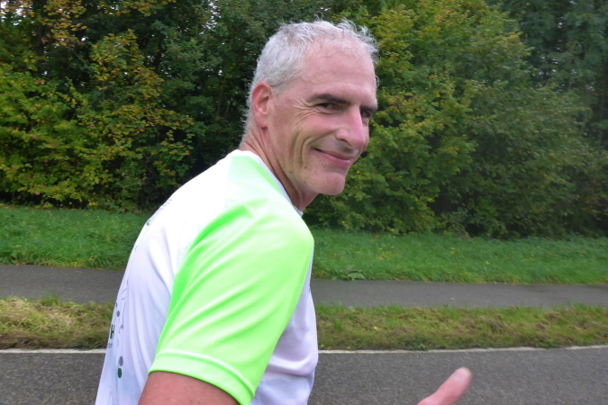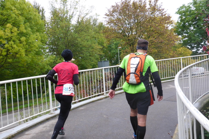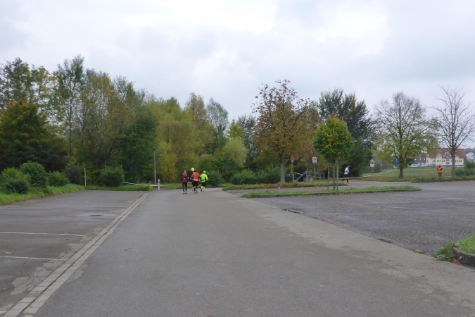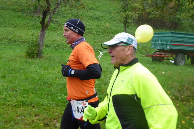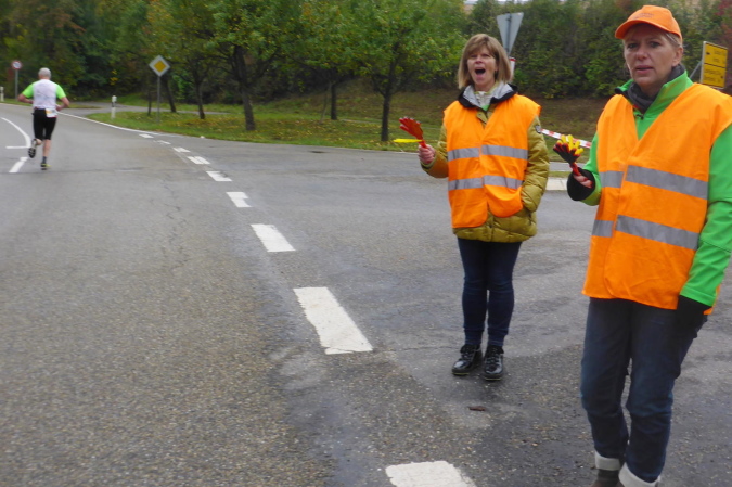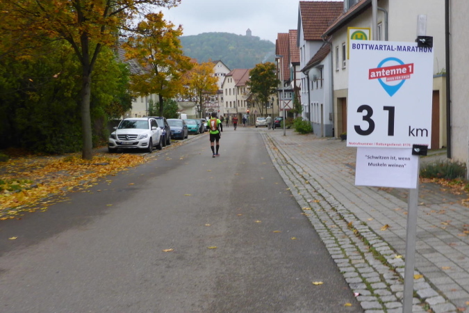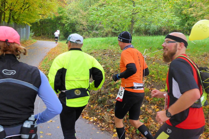 Plötzlich stellen sich mir einige Helfer in den Weg. Sie wollen mich zu einem Schnäpschen einladen. Da sag ich nicht nein. Der „Bärwurz“ ist nicht so scharf wie befürchtet und schmeckt ganz gut. Gerade kommt ein Pacer, erkennbar an seinem gelben Luftballon vorbei. Er soll den Marathon mit 4h45 beenden. Das Tempo ist für mich in Ordnung und so hänge ich mich an. Am Ortsausgang von Gronau kommt erneut eine VP. Diese lasse ich nach Kaffee und Schnaps mal lieber aus. Für die Marathonis ist hier km 26 für uns schon km 31. In Oberstenfeld werden wir rechts geleitet. Ich erinnere mich an letztes Jahr, als wir auf dem Radweg am Freibad vorbei, wegen der hohen Temperaturen noch sehnsüchtig auf die blauen Wasserflächen geblickt haben. Heute besticht der Weg aufgrund der bunten Herbstfärbung seiner Bäume und Sträucher.