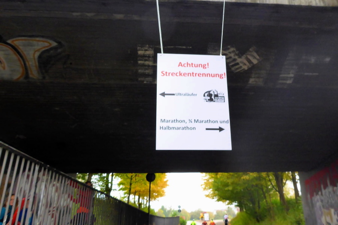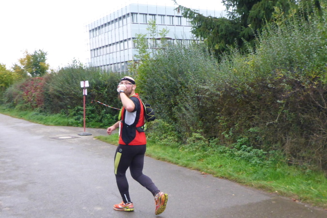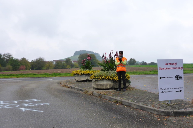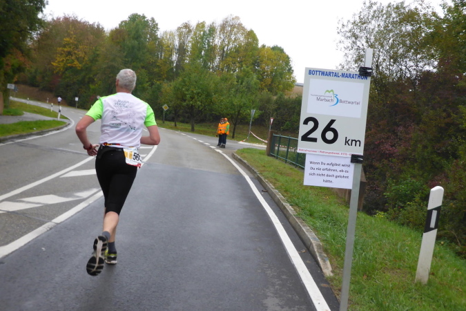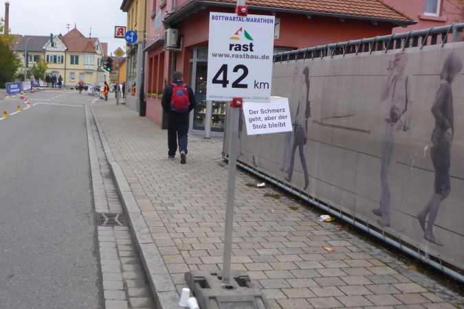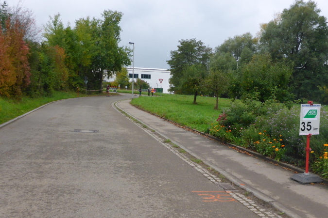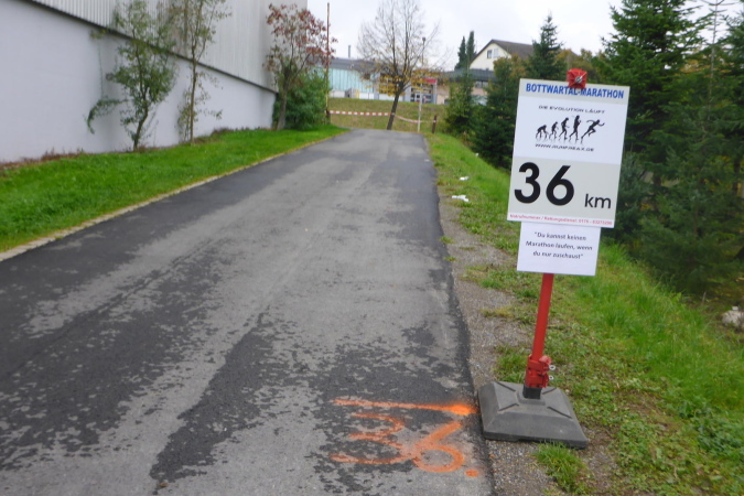 Die nächste VP bei km 42 ist erreicht. Der Helfer beglückwünscht mich und feuert mich an. Die Streckenpostin an der nächsten Kreuzung weist mich schon von weitem nach links. Nun geht es im Industriegebiet zweimal rechts und dann bin ich auf der Marathonstrecke. Ein Schild zeigt km 35 des Marathons. Ich versuche mich an die Vorjahre zu erinnern, kann die Strecke aber noch nicht einordnen. Erst als wir von hinten an die Bottwartal-Kellerei heran laufen, bin ich wieder in der Spur.