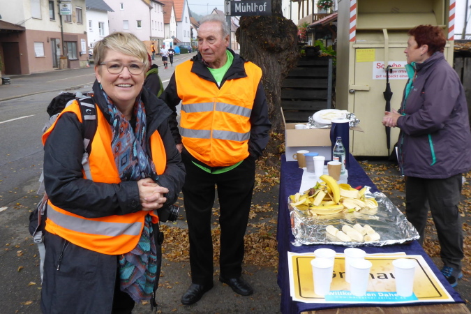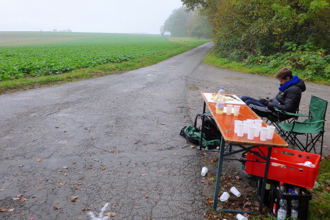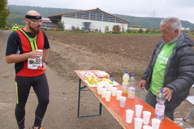 Eine Gruppe junger Mädels begrüßt hier jeden Läufer mit überschwänglichem Applaus, bereit jedem vorbeikommenden einen Becher in die Hand zu drücken. Ich mache erst mal Pause und halte ein Schwätzchen mit den Helferinnen. Sie haben gefühlt 4000 Becher ausgegeben und sind rechtschaffen müde. Gerade kommt auch Marcus, mein früherer Begleiter, vorbei. Nachdem Ulli die VP längst verlassen hat, freue ich mich über seine erneute Begleitung.
