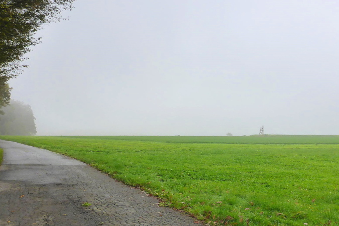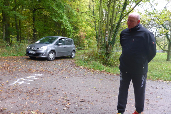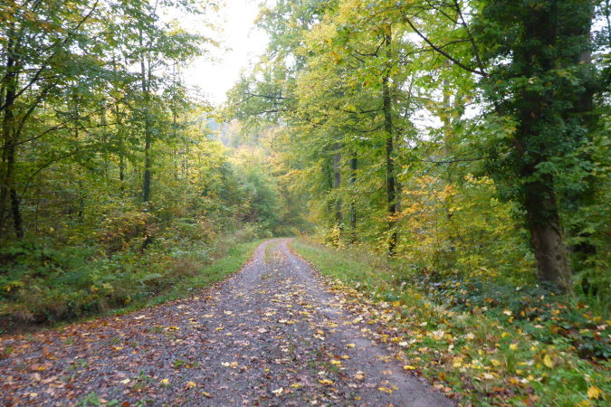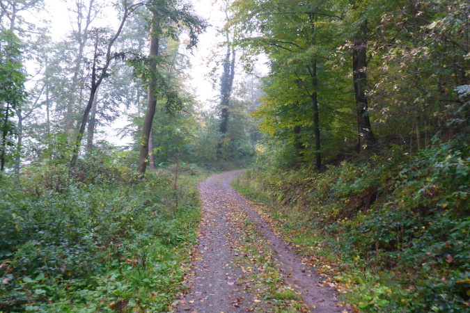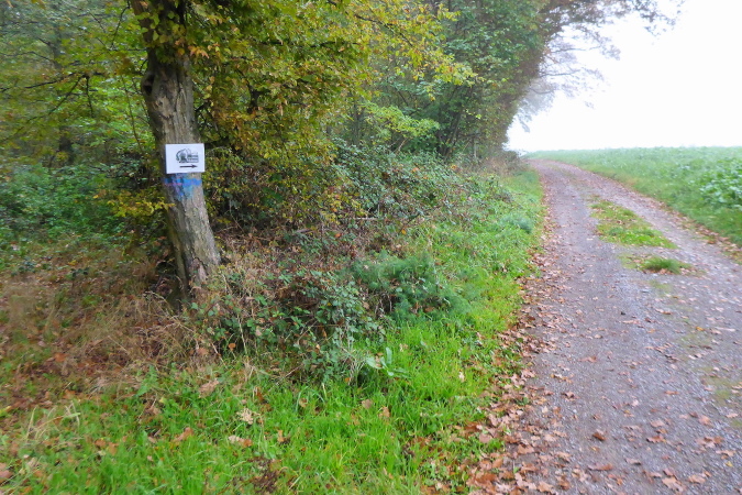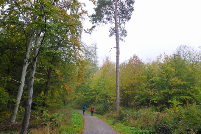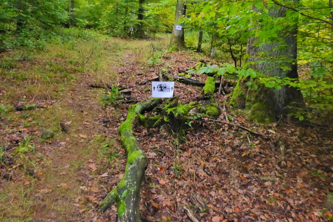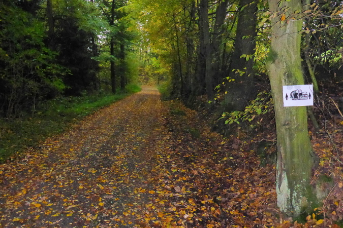 Die Straße führt nun in den Wald. Eine große Schleife bringt uns, ohne dass wir es jedoch mitbekommen, auf der Rückseite des Berges um die Burg herum. An der L118 erwarten uns Streckenposten, um den gefahrlosen Übergang über die Straße zu gewährleisten. Nun geht es bis zur VP bei km 25 leicht wellig ansteigend am Waldrand entlang. Nach einer ausgiebigen Stärkung an der VP führt der Weg wieder in den Wald. Ziemlich lang geht es jetzt geradeaus. Ein Schild zeigt rechts zum Prinz Friedrich Kochherd. Meine Recherche hat ergeben, dass es sich wohl um ein steinernes Jagddenkmal zu Ehren von Prinz Friedrich von Württemberg handelt, Vater des letzten Königs Friedrich II. von Württemberg. Dieser hatte hier ein Jagdrevier und der Kochherd diente der Verpflegung der Jagdgesellschaft. 2005 wurden die Überreste restauriert und mit einer Erläuterungstafel versehen. Leider kommen wir dort nicht vorbei.