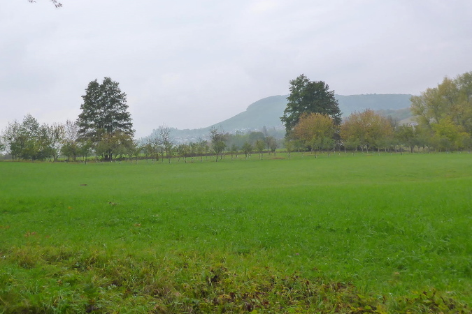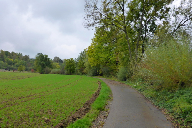 Unser Weg führt uns geradeaus weiter, dabei tendenziell bergab. Unten zweigt es scharf links auf den „unteren Stiftswaldweg“. Nach weiteren ca. 2 km geht dieser in den „Buchtraufweg“ über. Rechts zwischen niedrigem Gestrüpp mäandert der Kurzach. Der Wald wird lichter und geht unmerklich in Streuobstwiesen über. Bergab erreichen wir nun Gronau. An der kleinen VP entdecke ich Kaffee. Der ist eigentlich für die Helfer gedacht, trotzdem werde ich eingeladen. Während ich das heiße Getränk genieße, versuche ich mich zu orientieren. Ist dies die Stelle, wo früher der Ultra auf die Marathonstrecke gestoßen ist? Ich kann mich nicht genau erinnern. Auf jeden Fall bin ich nach dem hinter mir liegenden, wunderbar ruhigen Naturerlebnis, etwas überfordert vom lauten Citylauf-Feeling, das hier herrscht.